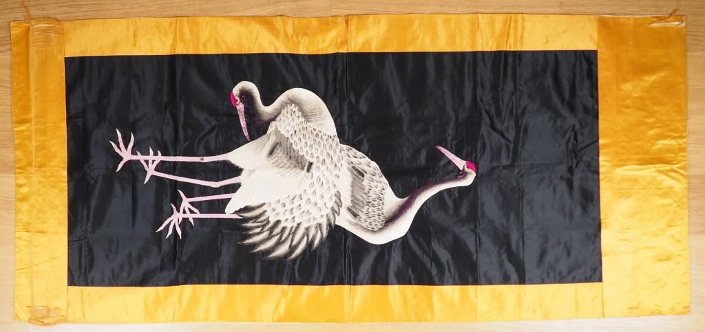 Grand panneau en soie noire brodée d’un couple de grues en camaïeu de gris et noir, le pourtour souligné de soie jaune. Japon, XXème siècle. Dim. 137 x 59 cm (déchirures sur la bordure)