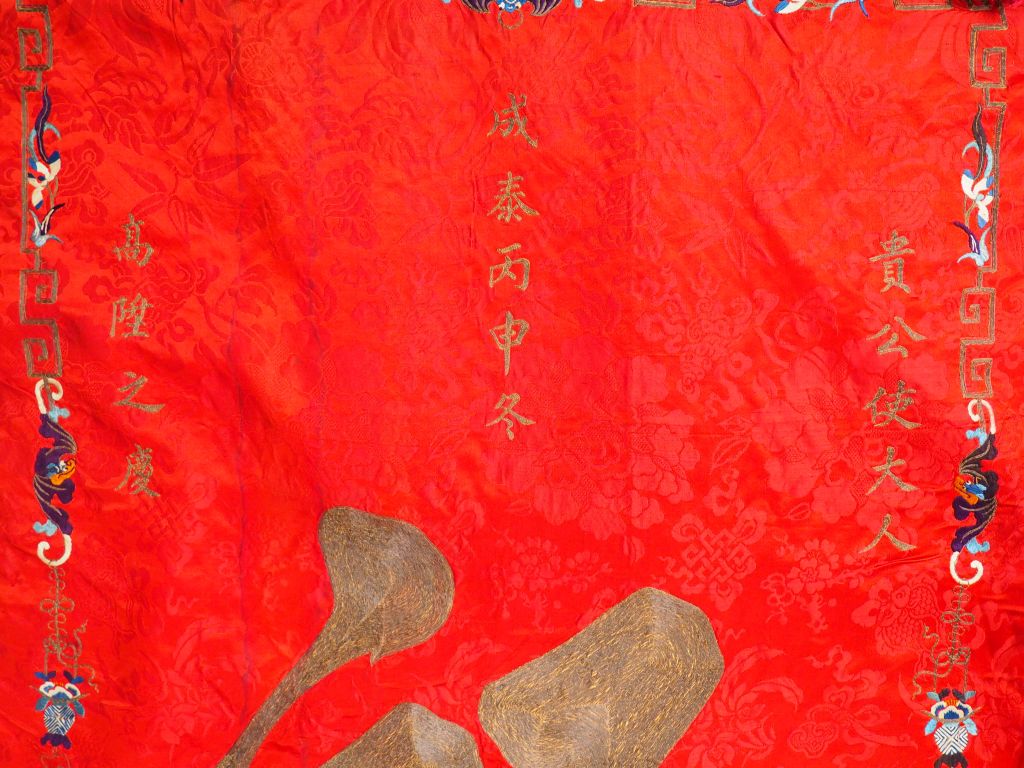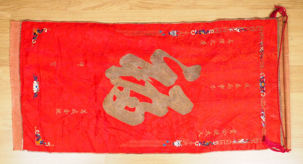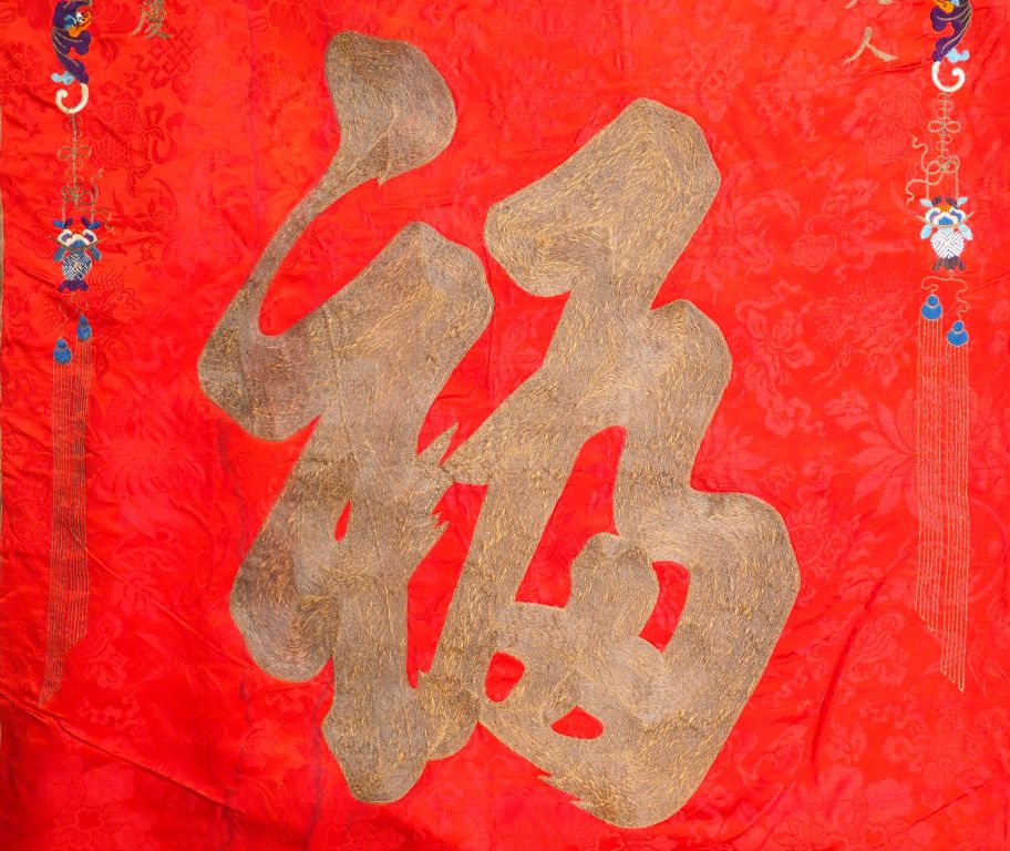 Grand panneau en soie rouge brodé aux fils polychromes et anciennement dorés, d’un grand caractère Fu (bonheur) entouré de plusieurs caractères auspicieux, le pourtour souligné de chauve-souris, motifs géométriques et de bon augure. Chine, début XXème siècle. 147 x 74 cm. (Taches d’humidité, salissures)