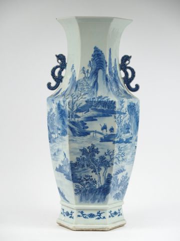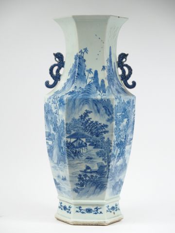 Grand vase de forme hexagonale en porcelaine blanche à décor en bleu sous couverte d'un village sur les bords d'une rivière entouré de pics de montagnes, (deux dragons formant anses) Chine XIXème siècle. H. : 59 cm (quelques petits éclats au col, monté en lampe)