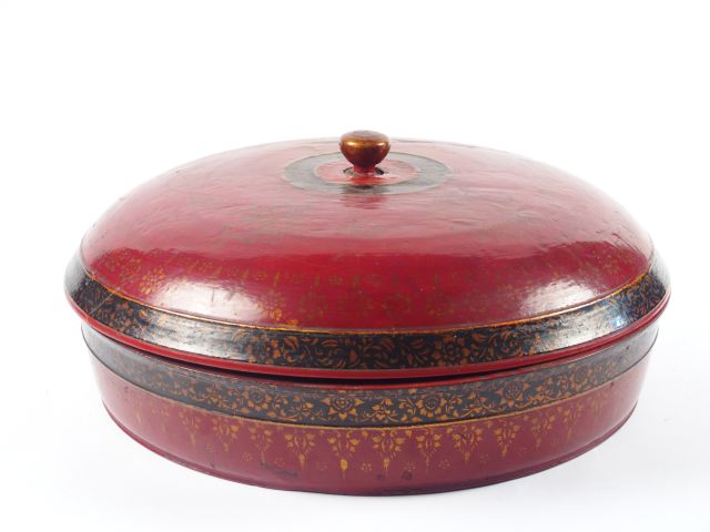 Grande boite en bois laqué rouge, noire et dorée, à décor d'objets précieux. Cambodge. XIXème