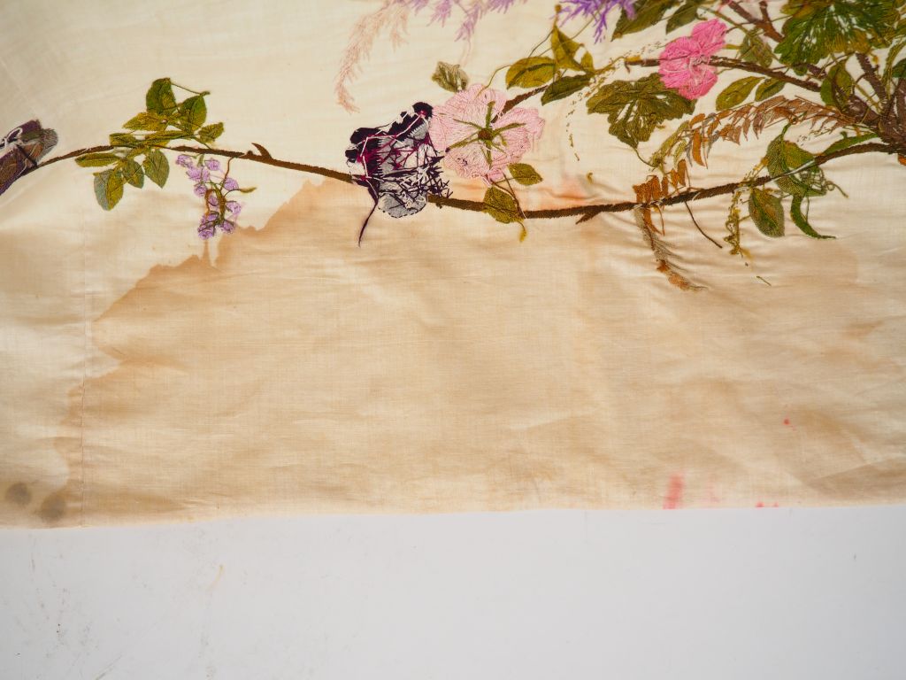 Grande tenture en satin de soie crème brodée aux fils polychromes d’un couple de faisans, oiseaux et papillons auprès d’une glycine en fleurs, le pourtour souligné de branches fleuries et bouquets animés d’oiseaux et papillons. Doublée de lin écru. Japon, première moitié du XXème siècle. Dim. ca. 220 x 130 cm (petites déchirures dans les angles inférieurs et sur les bords)