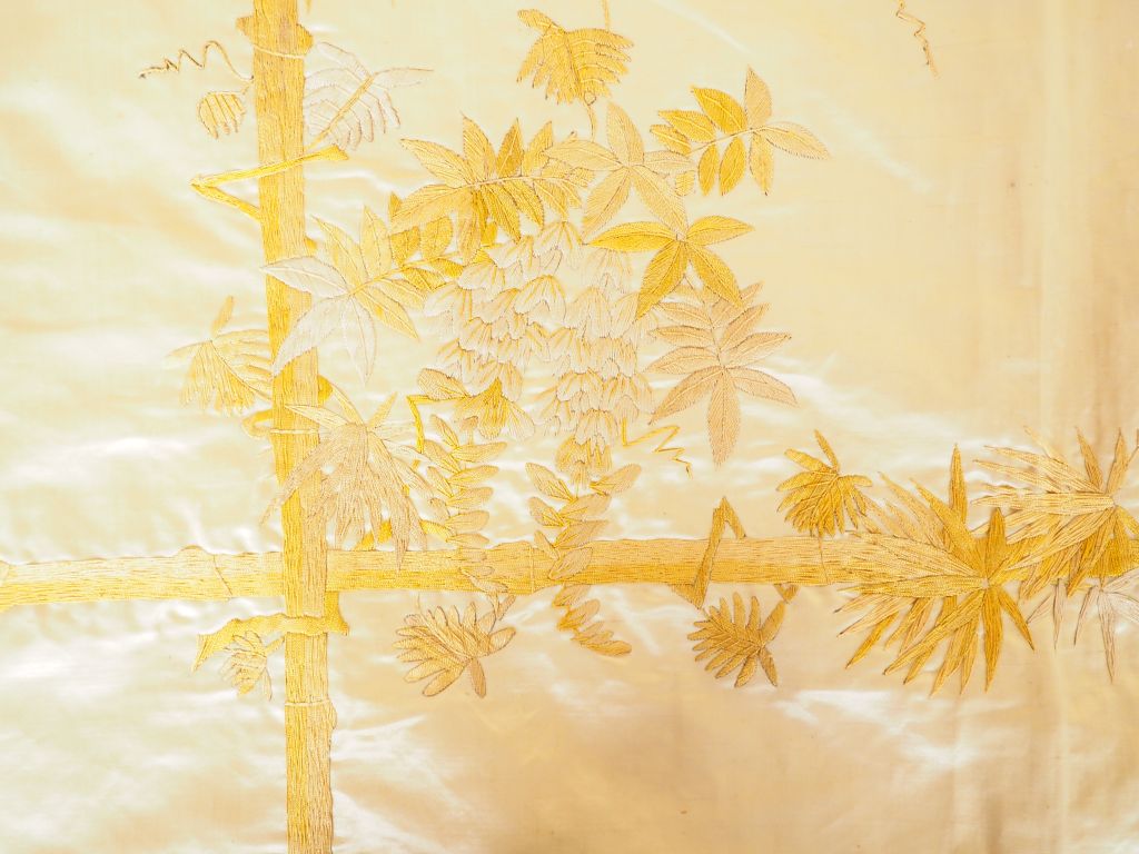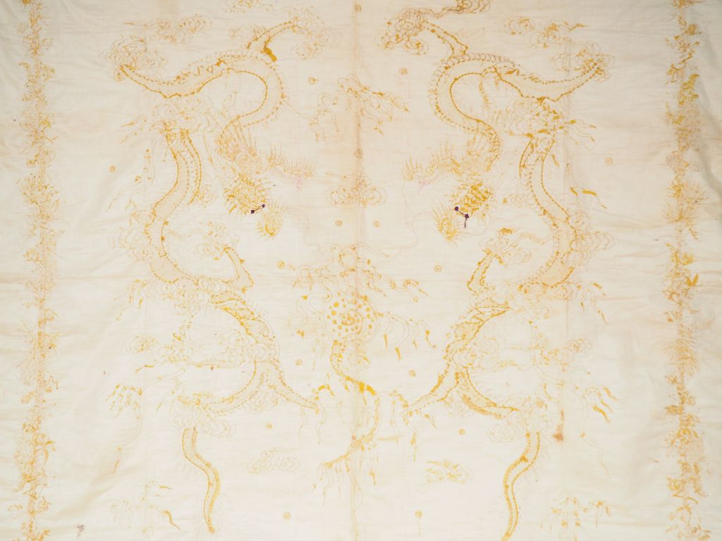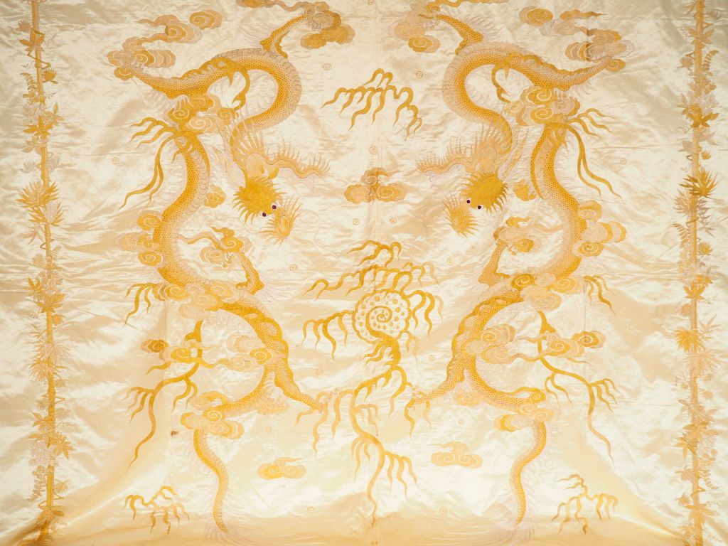 Grande tenture en soie crème brodée en camaïeu de jaune et écru de deux dragons de part et d’autre de la perle sacrée, le pourtour souligné de glycines s’enroulant autour de bambous. Chine du sud, début XXème siècle. (Petits accidents et salissures)