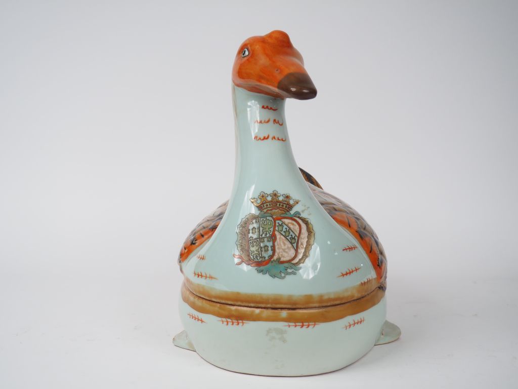 Grande terrine en porcelaine de Chine, compagnie des Indes, figurant un canard polychrome. Monogrammée sous la base. Dim : 35,5 x 38 x 27 cm.