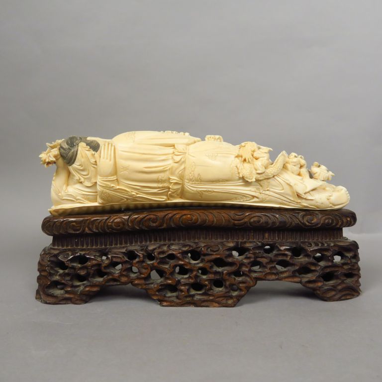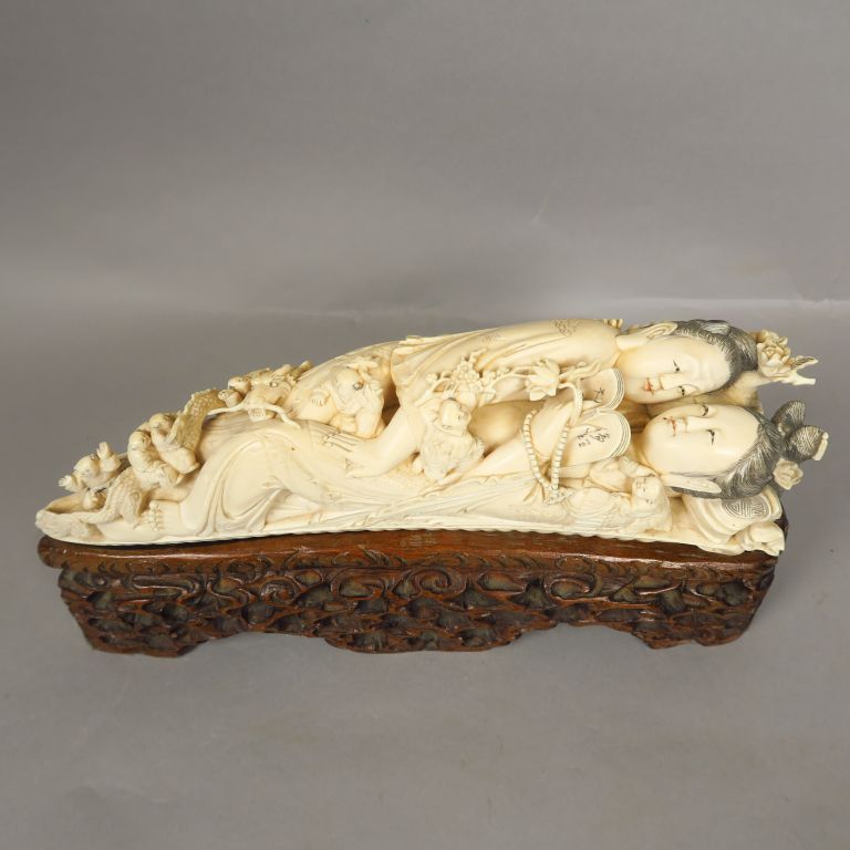 Groupe en ivoire représentant deux femmes allongées sur une grande feu...