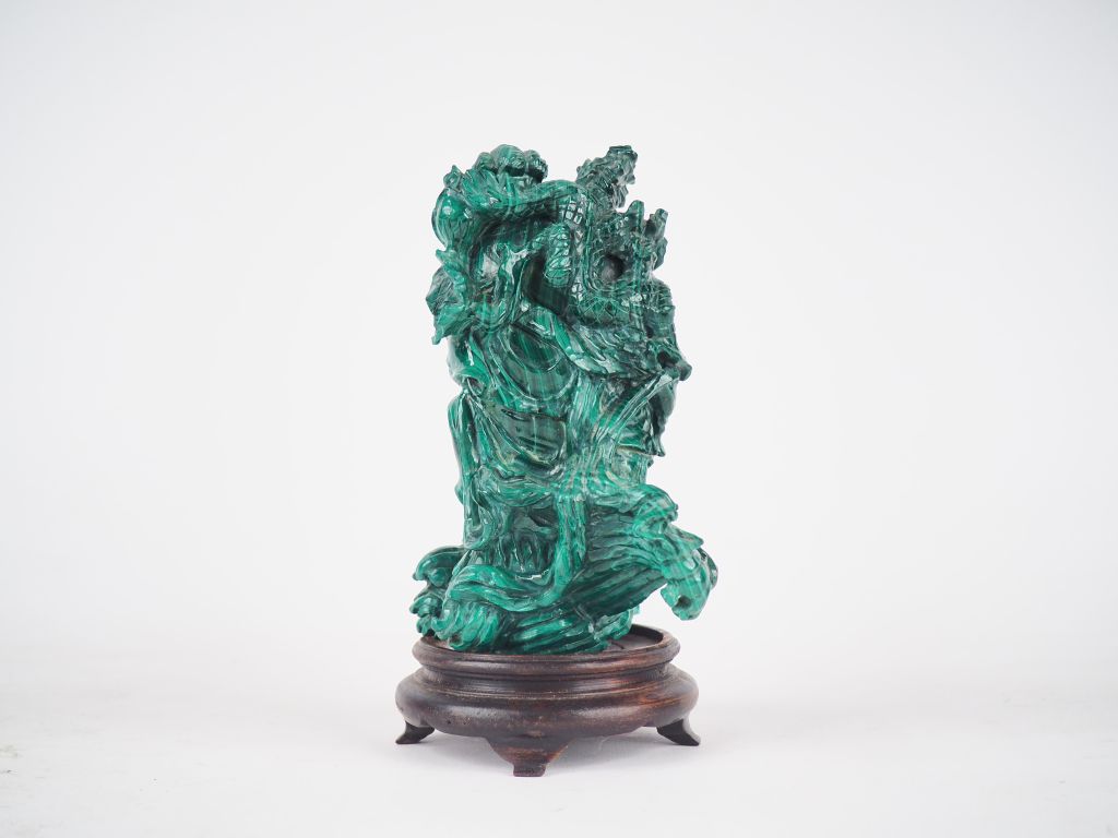 Groupe en malachite "jeune femme au lotus accompagnée de son serviteur" Chine vers 1960 H. 12,5 cm