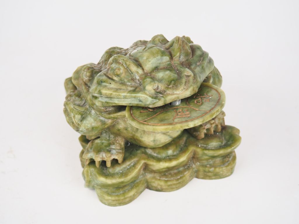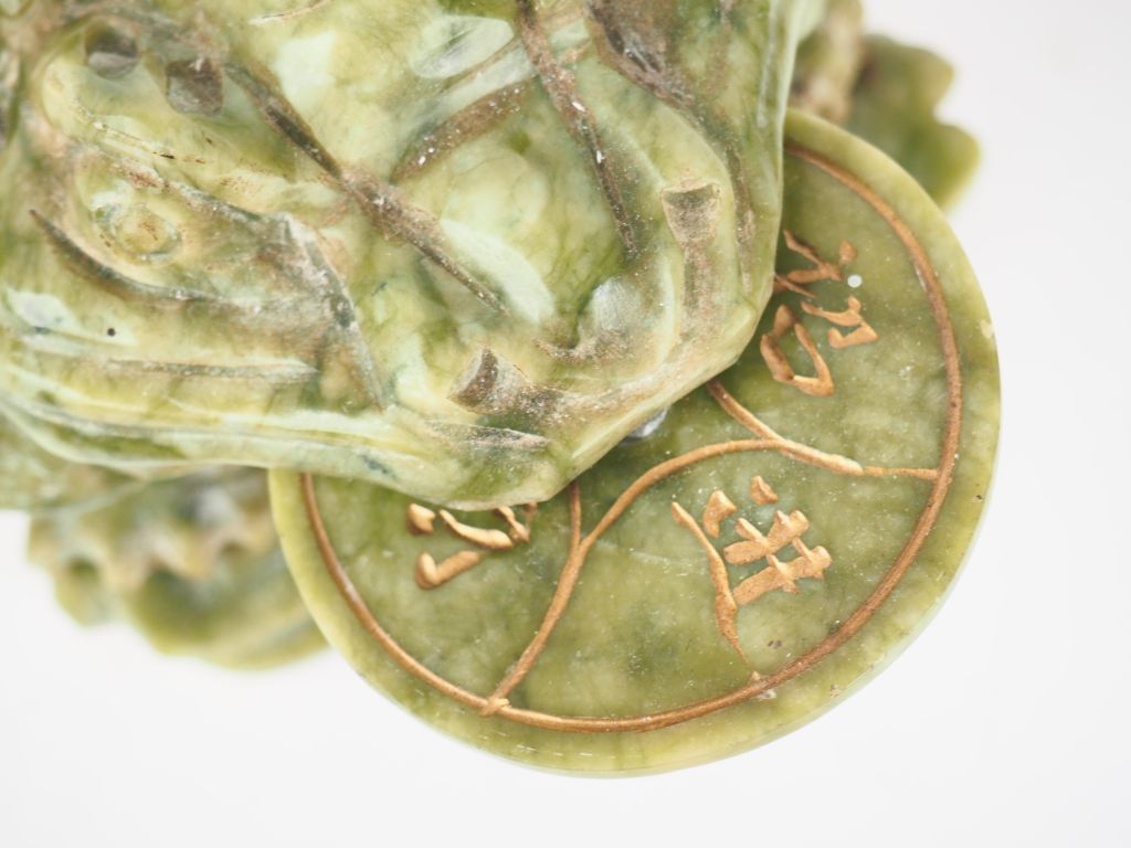 Groupe en serpentine "crapaud tenant une monnaie" Chine vers 1960 H. 13 cm