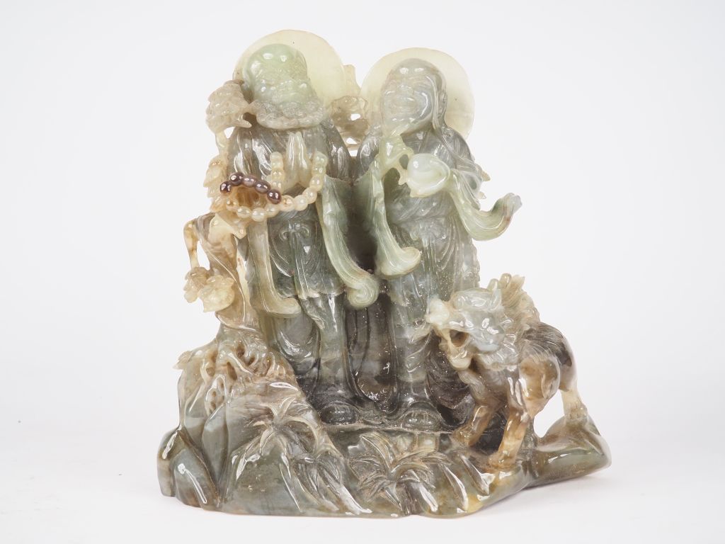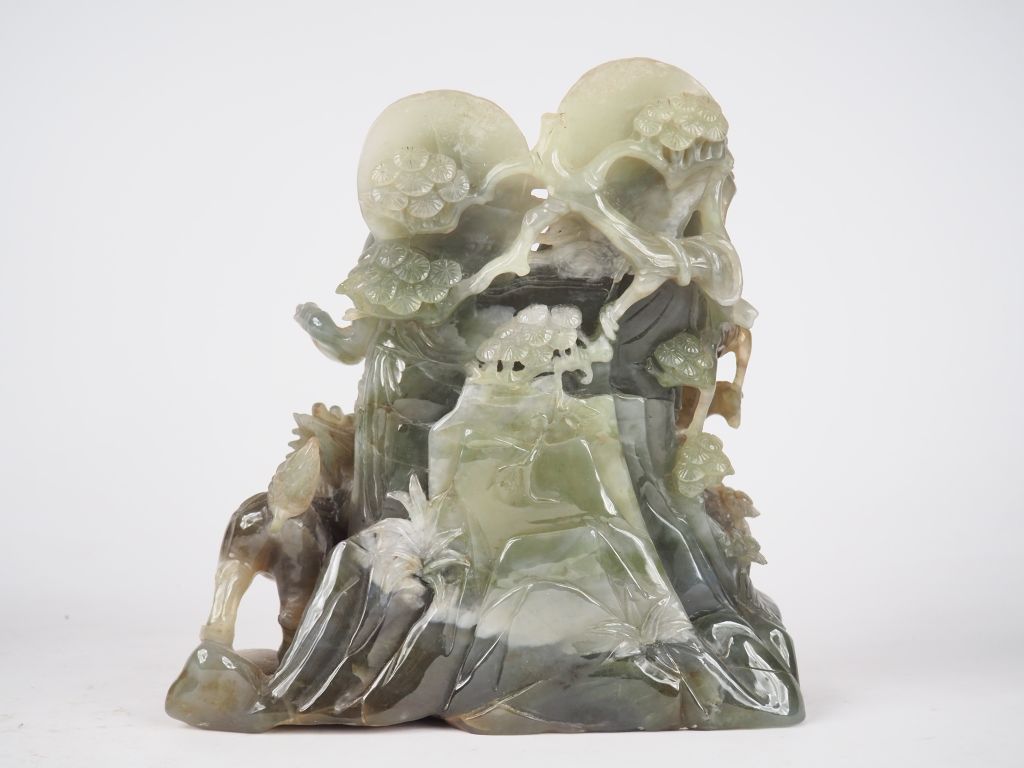 Groupe en serpentine vert clair représentant deux loans accompagnés d'un dragons Chine vers 1960 H. 25 cm