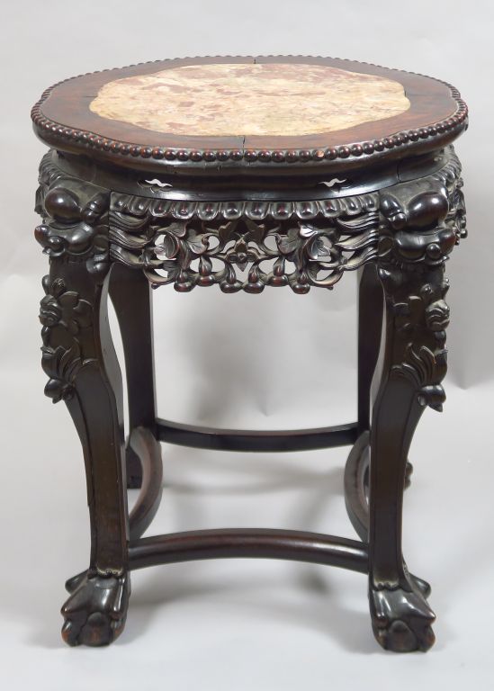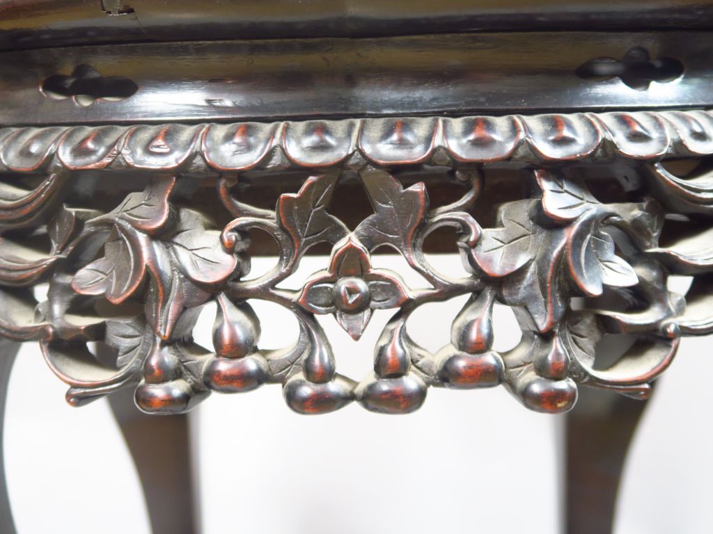 Guéridon en bois de rose à bord polylobé, reposant sur des pieds griffe, sculpté de têtes d'animaux fantastiques. Indochine, vers 1900. H.7,5 cm