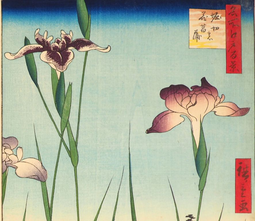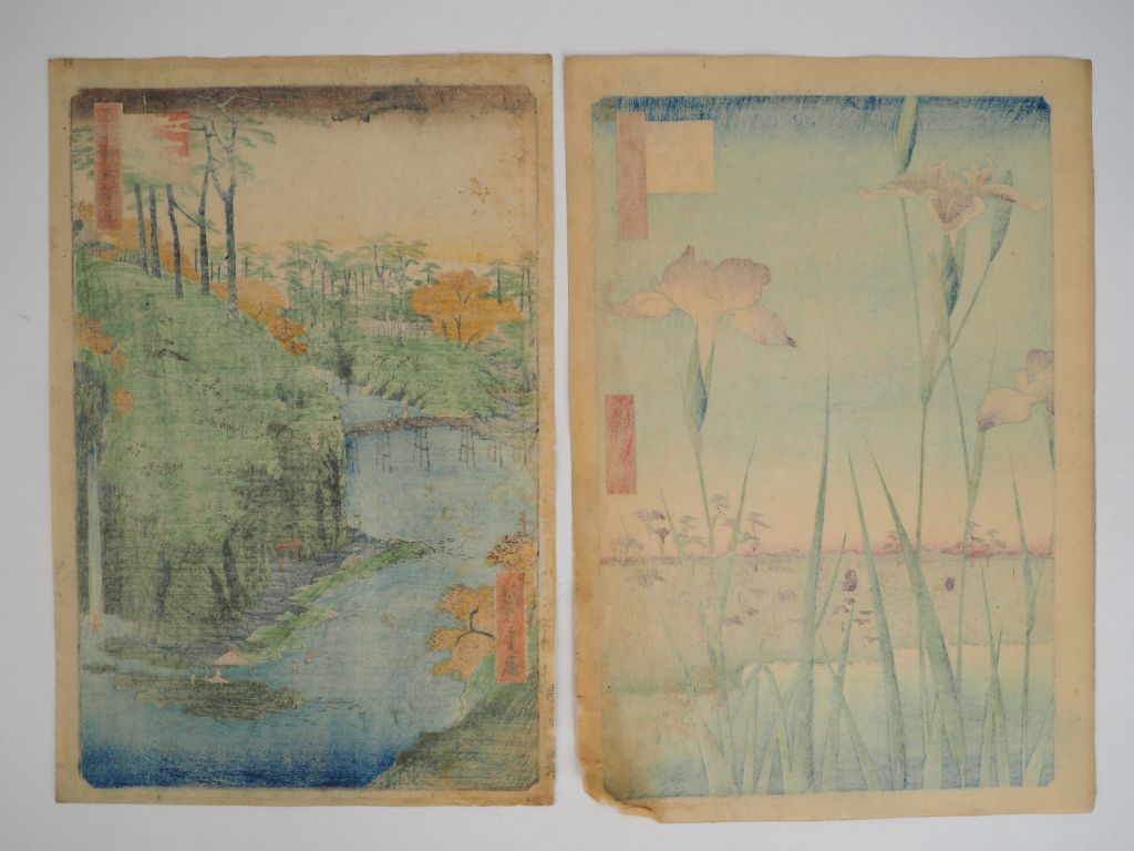 HIROSHIGE (1797-1858) Deux estampes oban tate-e de la série des « Cent vues célèbres de Edo », Meisho Edo Hyakkei . Editeur : Uoya Eikichi, vers 1856-1858 - Takinogawa à Ôji (Ôji Takinogawa) (Impression correcte, salissures, marges légèrement rognées, de petits trous en haut). - Jardin d’Iris à Horikiri (Horikiri no hanashôbu) (Salissures, accident à l’angle inférieur droit)