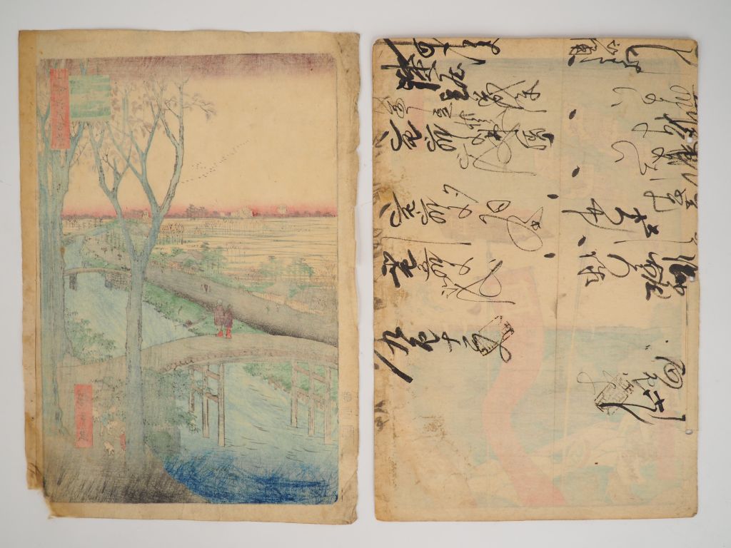 HIROSHIGE (1797-1858) Deux estampes oban tate-e de la série des « Cent vues célèbres de Edo », Meisho Edo Hyakkei. Editeur : Uoya Eikichi, vers 1856-1858 - La digue à Kume (Kumezutsumi) (Salissures, angle inférieur droit manquant, bord gauche accidenté) - Pont Kanasugi et Shibaura (Kanasubibashi shibaura) Salissures, feuille doublée et petits trous de montage dans la marge