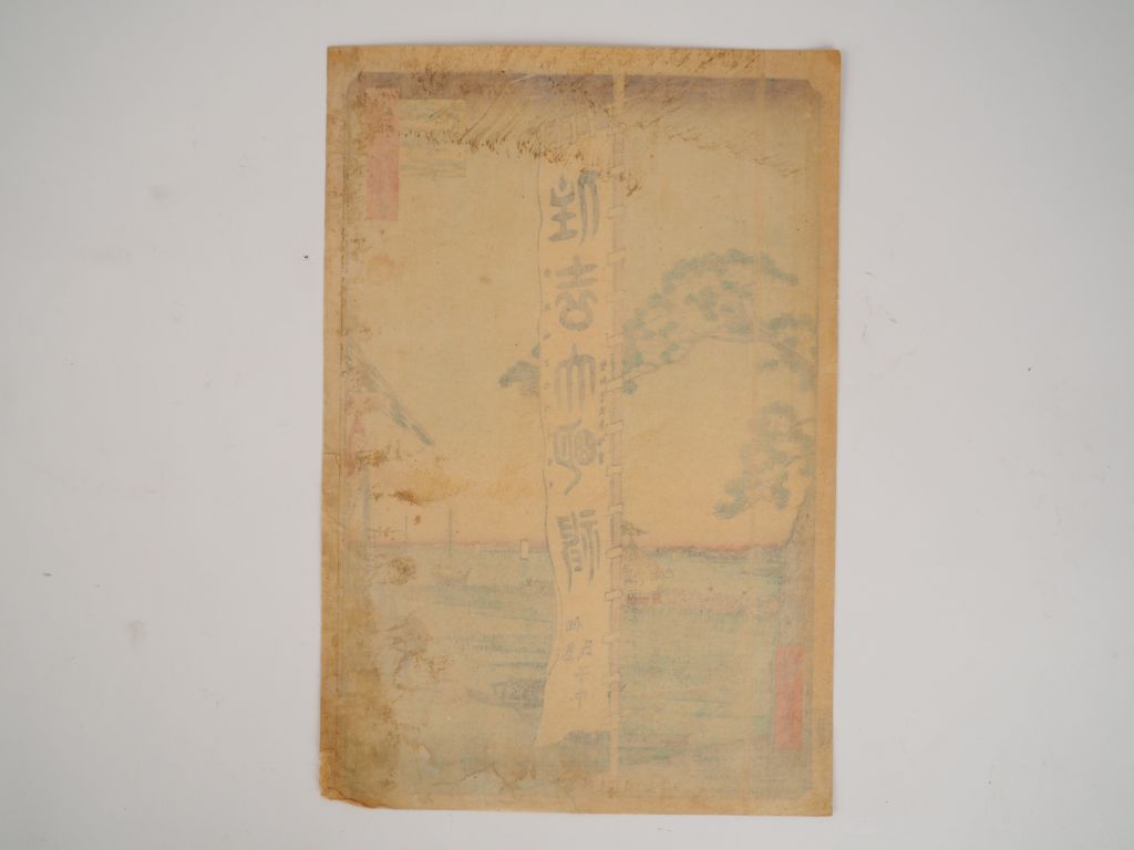 HIROSHIGE (1797-1858) Estampe oban tate-e de la série des « Cent vues célèbres de Edo », Meisho Edo Hyakkei. Editeur : Uoya Eikichi. - Festival Sumiyoshi à Tuskutagima (Tukudagima Tsumioshi no Matsuri) (Salissures, doublée, marges très légèrement rognées)