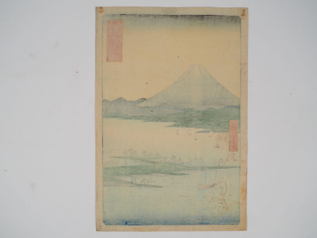 HIROSHIGE (1797-1858) Estampe oban tate-e de la série des « Trente-six vues du Mont Fuji », Fuji Sanjûrokkei. Editeur : Tsutaya. Suruga Miho no matsubara , Plage des pins à Miho dans la province de Suruga (Salissures)