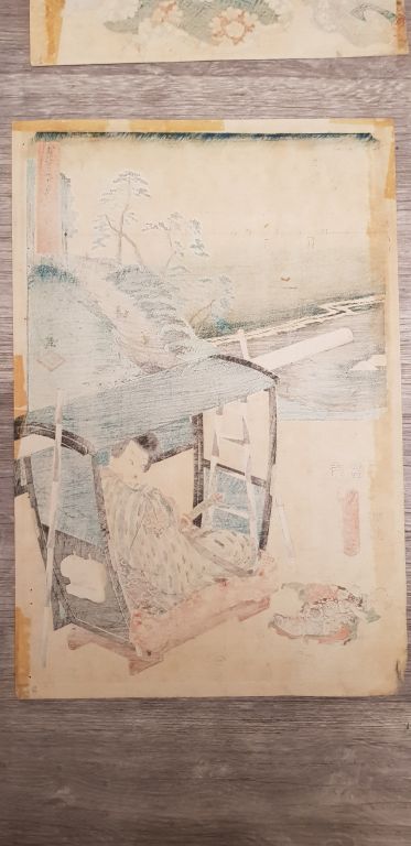 HIROSHIGE (1797-1858) et TOYOKUNI III (1786-1865) Trois estampes de la série des « Cinquante-trois stations du Tokaidô » dit « Tokaidô à deux pinceaux », Sôhitsu Gojûsan tsugi. Editeur : Maruya Kyūshirō, vers 1854-1855. Comprenant : - Nissaka, Sayo no Nakayama et une vue du Mont Muken - Shirasuka, vue panoramique de Shiomizake , l’acteur Ichikawa Danjūrō VIII dans le rôle de Jiraiya - Fujikawa, voyageuses (Jaunies, salissures, deux angles inférieurs gauches légèrement abimés)