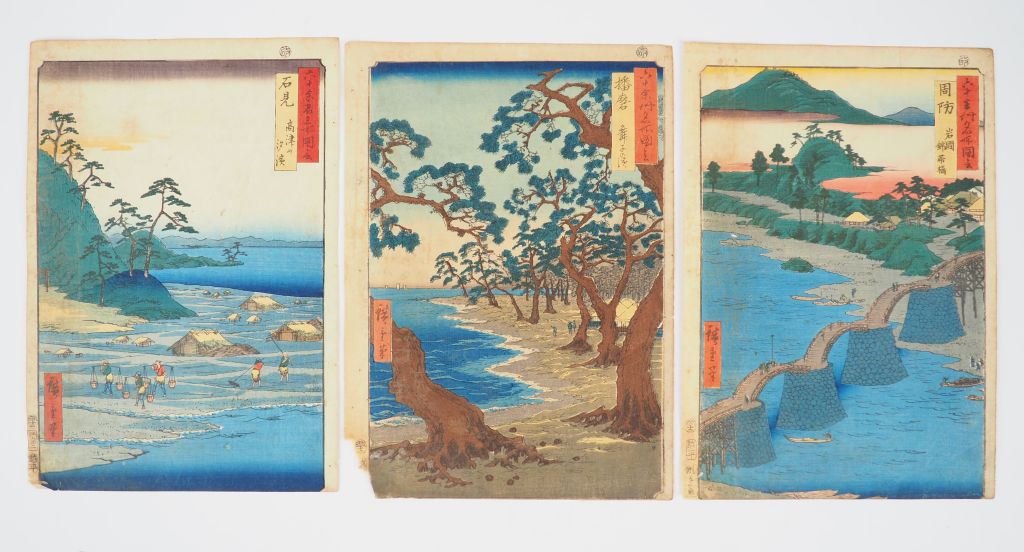 HIROSHIGE (1797-1858) Huit estampes oban tate-e de la série des « Vues de lieux célèbres dans les soixante et quelques provinces », Rokujiû yoshû meisho zue Editeur : Koshihei (Koshimuraya heisuke) Comprenant : - Wakasa gyosen kareiami , Bâteau de pêche au filet dans la province de Wakasa - Echizen tsuruga kebi no matsubara , La forêt de pin de Kebi à Tsuruga, province d’Echizen - Tamba kagamizaka , La colline miroir, province de Tamba - Hoki Ôno ôyama enbo , Vue lointaine du mont Oyama près de Ono, province de Hoki - Iwami takatsuyama shiohama , La plage des salines près du mont Takatsu, province d’Iwami - Harima maiko no hama , La plage de Maiko, province de Harima - Suô Iwakuni kintaibashi , Le pont de Brocart à Iwakuni, province Suô - Awa Naruto Fûha , Mer forte à Naruto, province de Awa (La plupart des marges inférieures coupées, certaines autres légèrement rognées, angles inférieures gauches fragilisés, salissures, deux doublées)