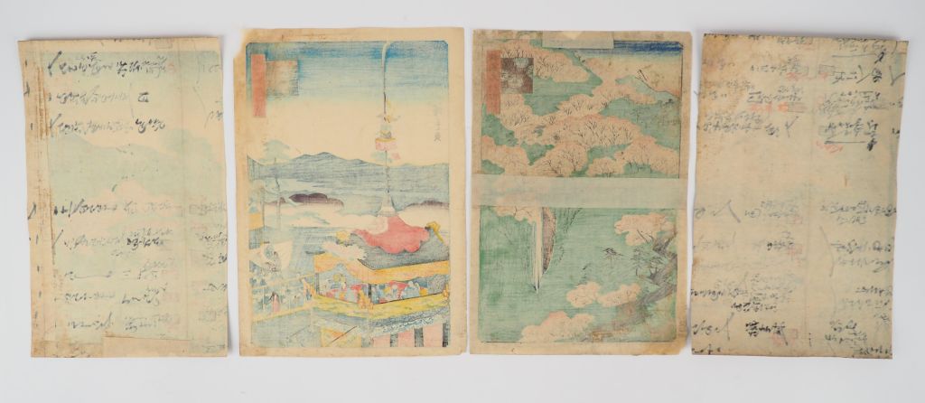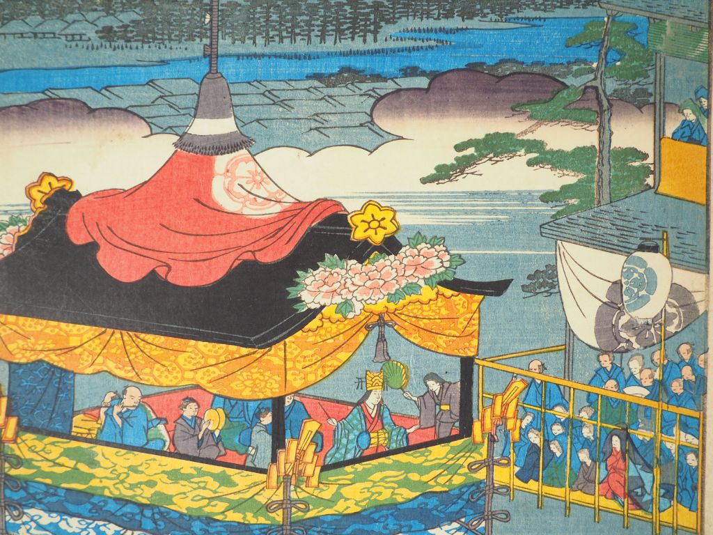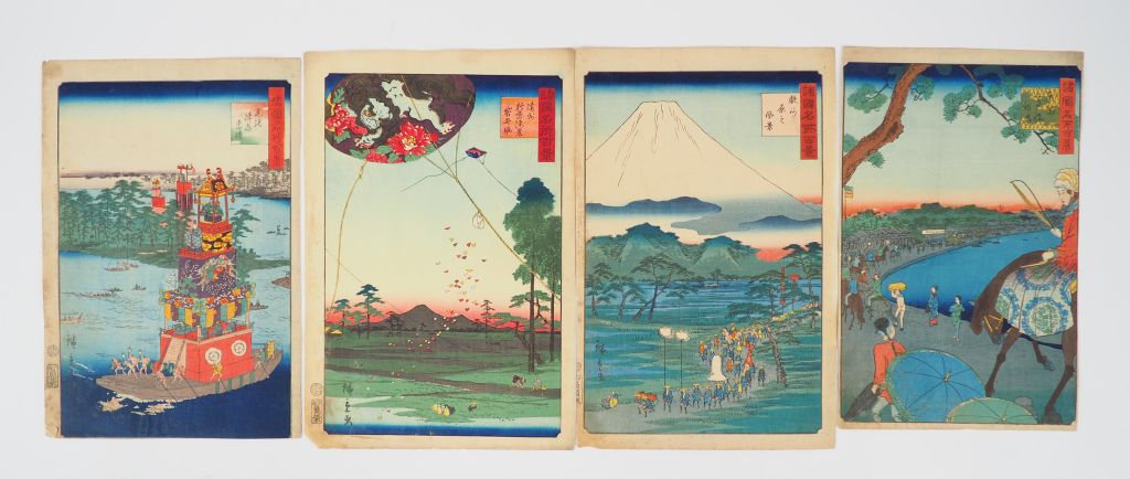 HIROSHIGE II (1859-1861), Quatorze estampes de la série des « Cent vues célèbres de diverses provinces », Shokukû meisho hyakkei, éditeur : Uoya Eikichi, vers 1859. Comprenant : - Pont Megane à Ôtani, province de Yamashiro - Festival de Gion Kyôto - Le mont Yoshino dans la province de Yamato - Erables à Ushitaki, province de Senshû - Festival de Tsushima, province d’Owari - Cerf-volant et vue du mont Akiba, de Fukurio, province Enshû - Vue aérienne de Hara, province de Suruga - La côte à Takanawa, à Edo - Ile de Matsu, province de Ôshû - Le sanctuaire Takabi, province Oki - Les tourbillons à Hita, province Bungo - Chasse à la baleine à Gotô, province de Hizen - Pont Tsûten-kyô , temple du Tôfuku à Kyôto - Vue de Maruyama à Nagasaki (Salissures, des marges coupées, certains angles fragilisés, et certaines feuilles doublées)