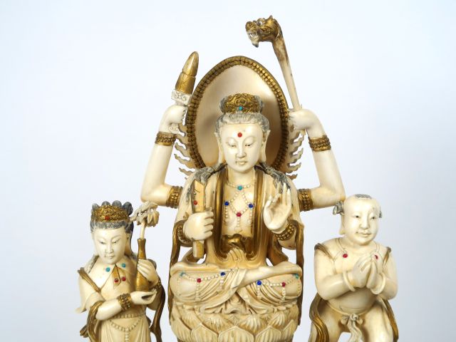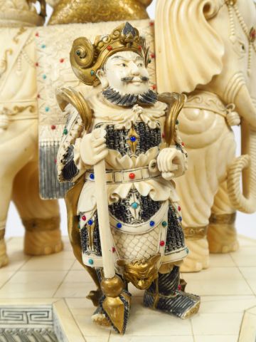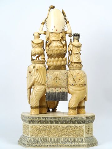 Important groupe en ivoire représentant Gouani entouré de deux adorants sur un éléphant, à ses pieds Guan di. Chine vers 1930. H. 68,5 cm Poids : 14,3 kg Nom scientifique de l’ivoire : ivoire d’éléphant Elephantidae spp (I/A, pré-convention), spécimen antérieur au 1er juin 1947 et conforme à la réglementation CE 338/97 du 09/12/1996, art. 2-W mc. Pour une sortie de L’UE, un CITES de ré-export sera nécessaire, celui-ci étant à la charge de l’acquéreur.
