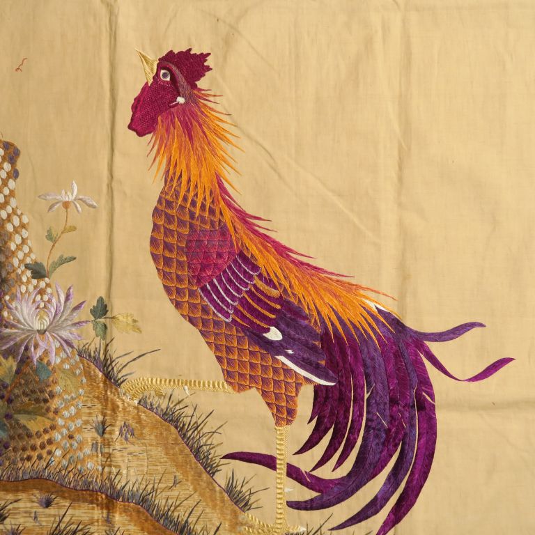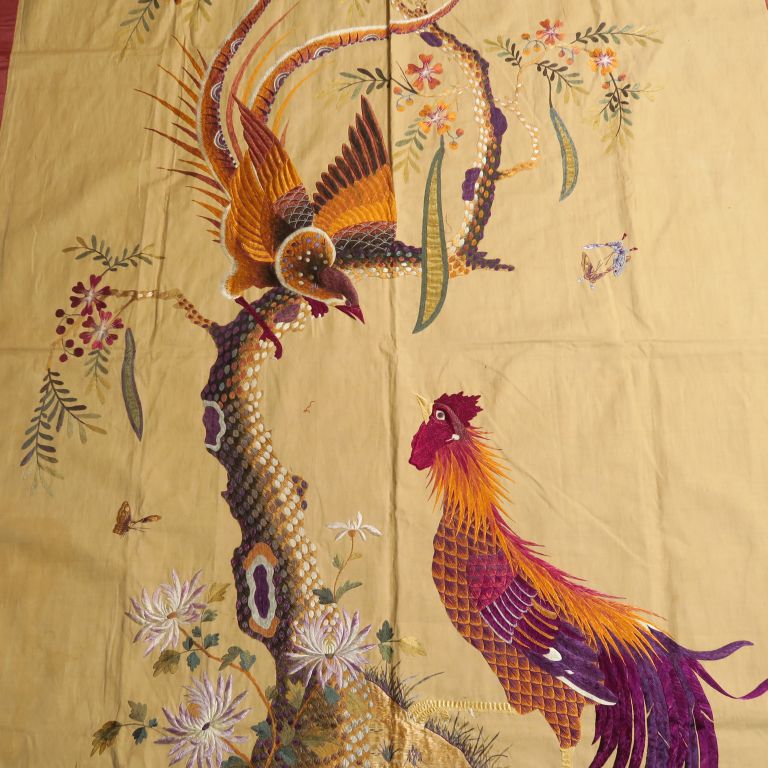 Important panneau en lin brodé en polychromie d’un coq et d’un phénix. Indochine, vers 1920. Dim. 184 x 114 cm