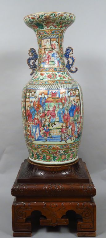 Important vase de palais en porcelaine et émaux de la famille rose, à décor de cérémonie taoiste en médaillon, de l'arrivée d'un mandarin et de sa suite, et d'oiseaux, fleurs et papillons. Deux dragons stylisées ornent la base du col. Chine, vers 1880. H. 85,5 cm (accidents)