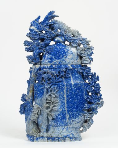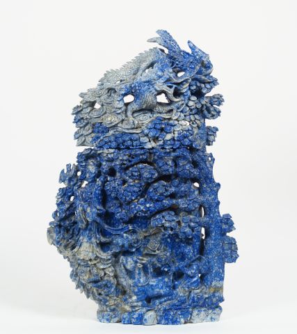 Important vase en lapis lazzuli représantant une jeune musicienne près d'un bufle. Couvercle décoré d"un dragon et d'un phoénix. H. 54 cm (petits éclats)