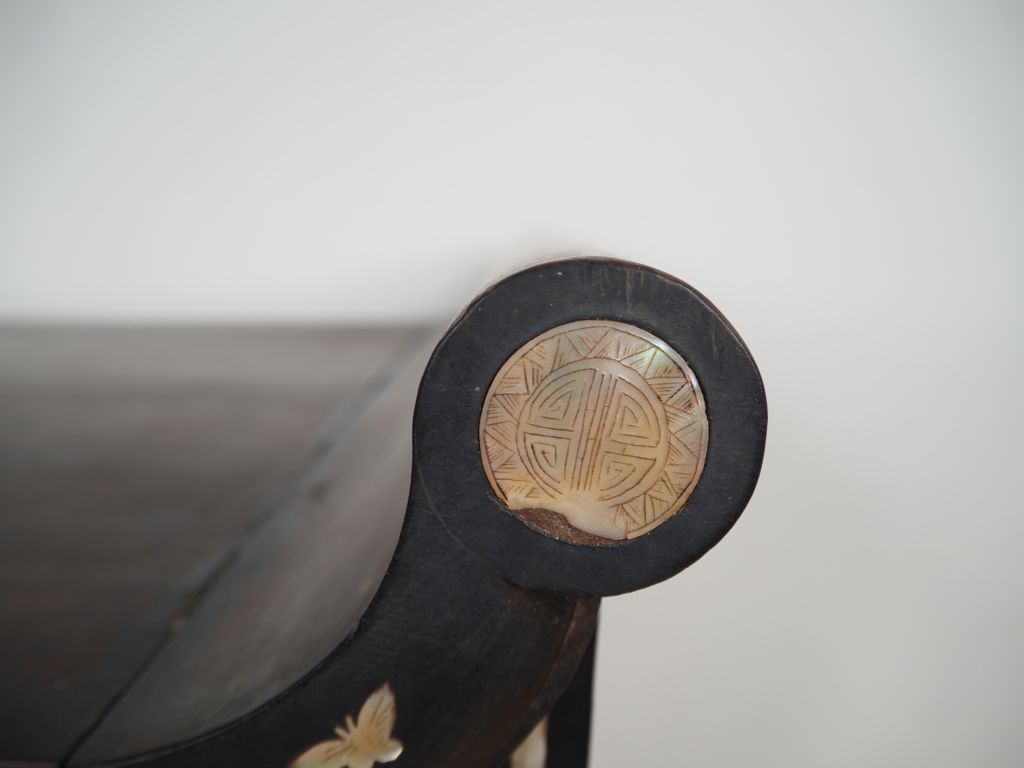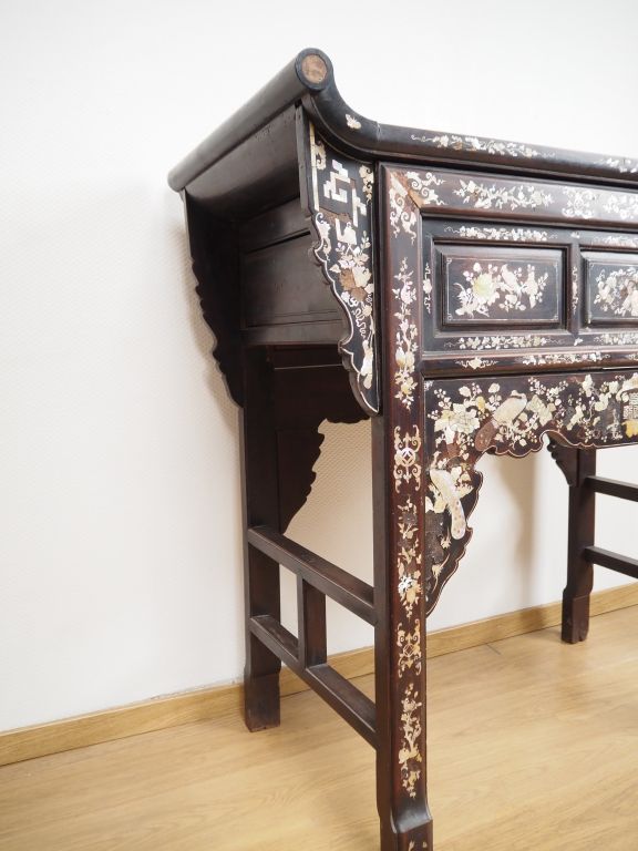 Importante console reposant sur 4 pieds en bois de palissandre "dalbergia cochinchinensis" à décor finement décoré en marqueterie de nacre de faisans évoluant parmi des branchages fleuris, objets mobiliers, compositions florales et de motifs auspicieux. Les extrémités du plateau à enroulement. Indochine XIXème dynastie des Nguyen. Dim. 107 x 110 x 57 cm. (accidents, manques, sauts de nacre)