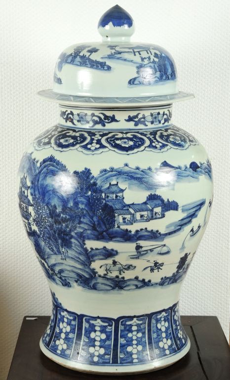 Importante potiche couverte en porcelaine à décor de personnages Chine deuxième moitié du XIXème (couvercle accidenté, fel traversant H. 78 cm