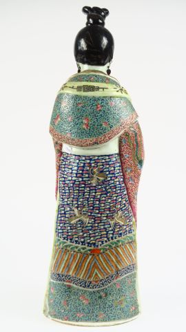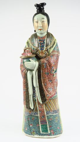 Importante statuette en émaux famille rose représentant une jeune femme en habit de cour tenant une coupe qui porte des pêches de longévité. Chine, période Qianxu, vers 1880. H. 56 cm