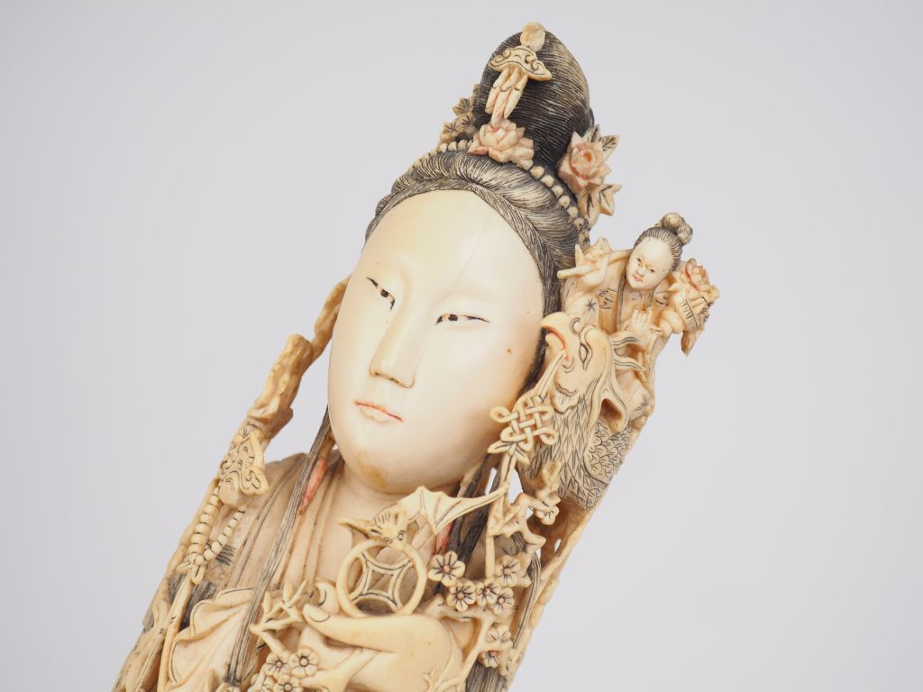 Importante statuette en ivoire finement sculpté représentant Guanyin accompagnée d'une jeune femme et d'un enfant présentant des offrandes, un phoenix et un dragon complètent le décor. Chine, vers 1900. H. 47,5 cm. Poids : 2330 g. (petites égrenures). Nom scientifique de l’ivoire : ivoire d’éléphant Elephantidae spp (I/A, pré-convention), spécimen antérieur au 1er juin 1947 et conforme à la réglementation CE 338/97 du 09/12/1996, art. 2-W mc. Pour une sortie de L’UE, un CITES de ré-export sera nécessaire, celui-ci étant à la charge de l’acquéreur.