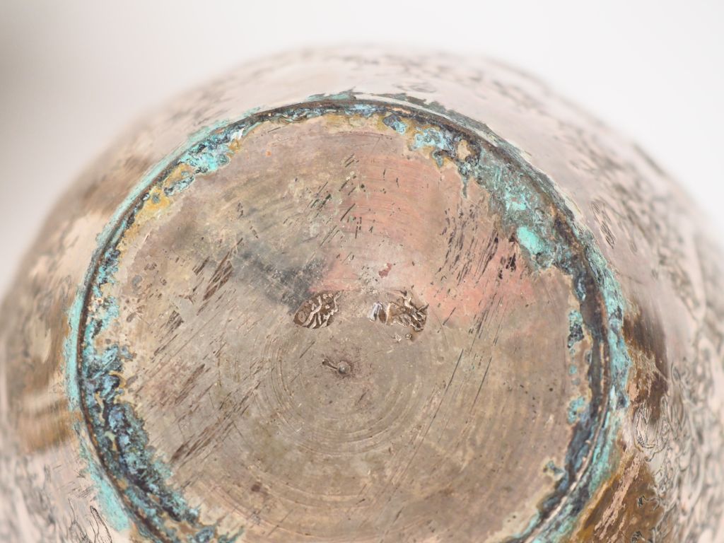 Inde, fin du XIXe siècle, Lot en argent ciselé et repoussé, comprenant quatre pièces dont un vase ovoïde à décor en médaillons de paon, fleurs d’hibiscus et boutons de lotus, une coupe reprenant la forme d’un lotus à décor de rinceaux, un plateau finement ciselé d’un paon stylisé et éléphants apposés en frise sur le pourtour, une boîte couverte reprenant des motifs similaires. Dim. plateau. 17 x 22 cm D. coupe. 20,5 cm H. du vase 18 cm H. boîte. 9,5 cm Poids. 1,349 kg