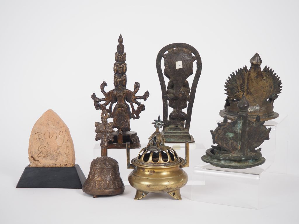 Inde, Népal, Tibet, Birmanie et Vietnam, XVIII-XIXe siècle et XXe siècle Lot comprenant, deux lampes à huile formées de yoni , une cloche Gantha , statuette d’Avalokitesvara , statuette de divinité tantrique sous le cobra , stèle votive , brûle-parfum tripode. H. 11,5 à 15,5 cm