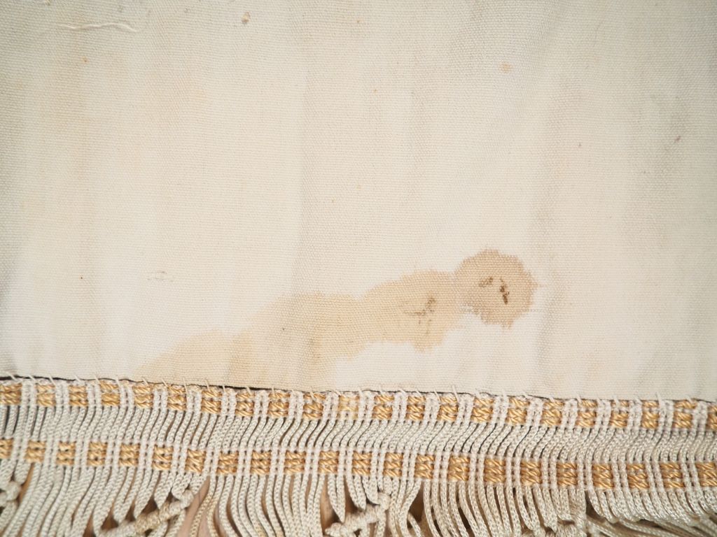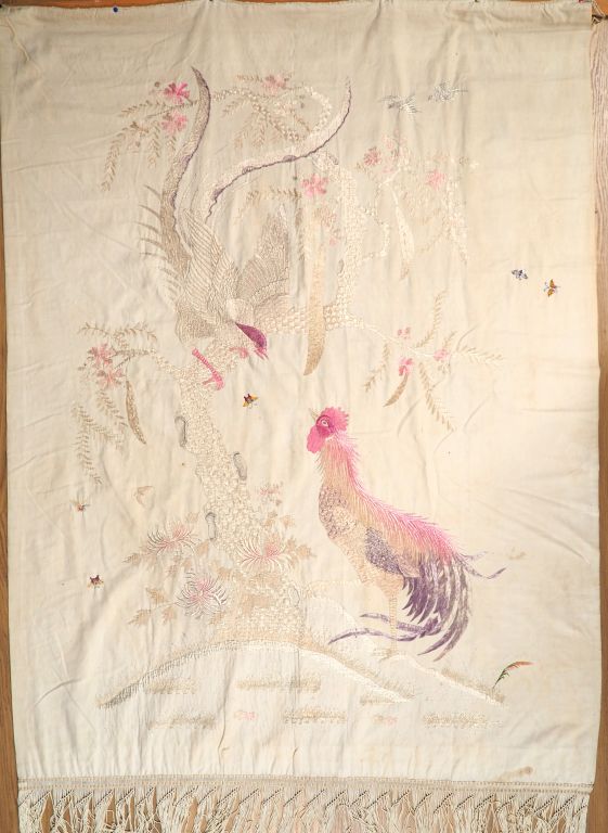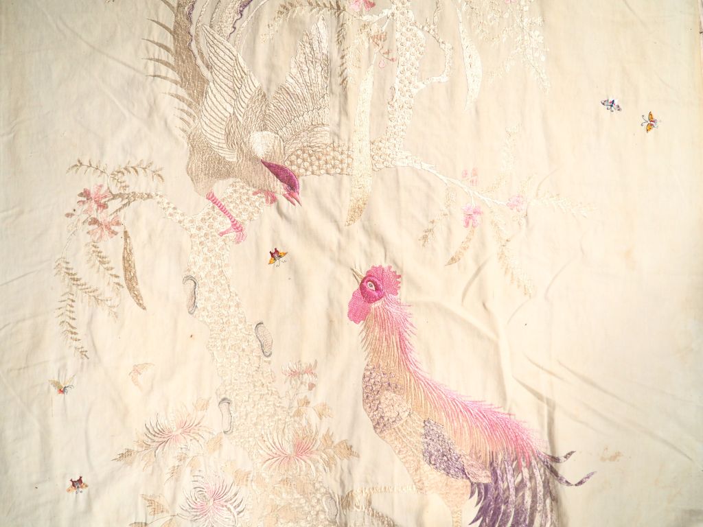 Indochine, début Xxème. Grande soie brodée à décor de faisans branchés sur un arbre en fleurs et d'insectes. Dim. 171 x 129,5 cm (taches)