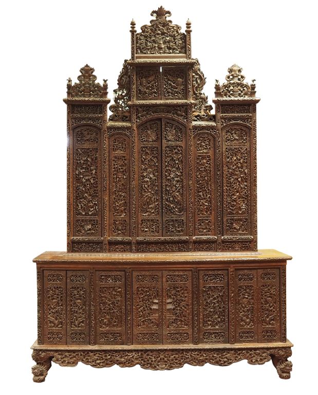 Indochine, dynastie des Nguyen vers 1880, Important meuble deux-corps en bois finement sculpté et ajouré de fleurs et rinceaux feuillagés, pagodons…reposant sur quatre pieds zoomorphes. Dim. 305 x 206 x 57 cm
