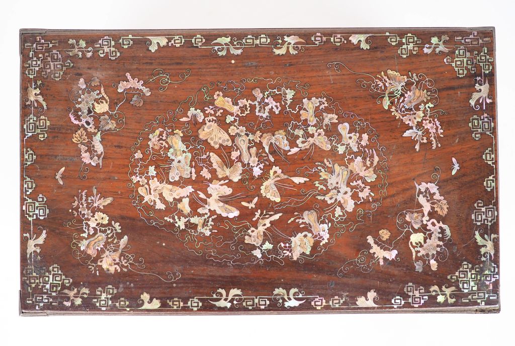 Indochine vers 1900, travail de Nam Dinh Coffret en bois incrusté de nacre à décor de papillons et rinceaux feuillagés. Dim. 14 x 33 x 20 cm.