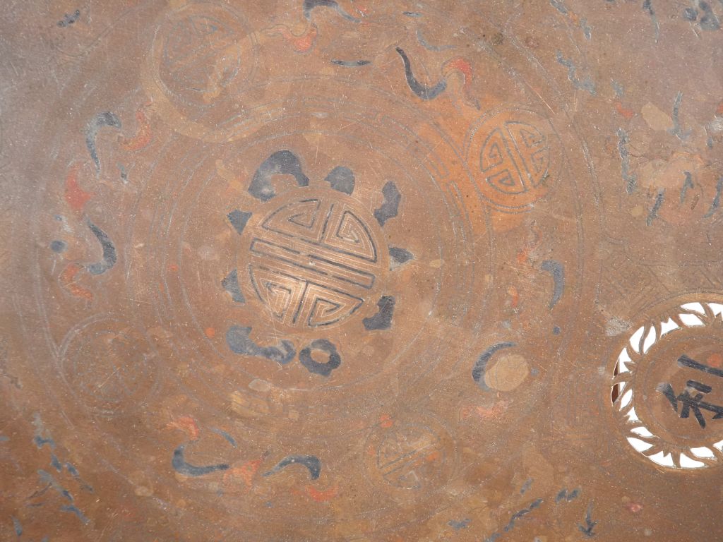 Indochine, vers 1920, Important plateau octogonale en cuivre, à décor niellé et ajouré, de symboles shou, calligraphies et motifs stylisés. Diam. 70 cm