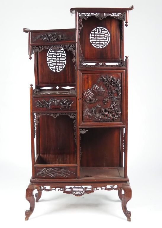 Indochine, vers 1920 Meuble à étagères à pieds galbés, ouvrant à une porte en bois naturel, à décor en demi-relief d’un homme sur une embarcation face à un pavillon dominant un fleuve, compositions florales, calligraphies stylisées et grecques complétant l’ornementation. (accidents, manques)