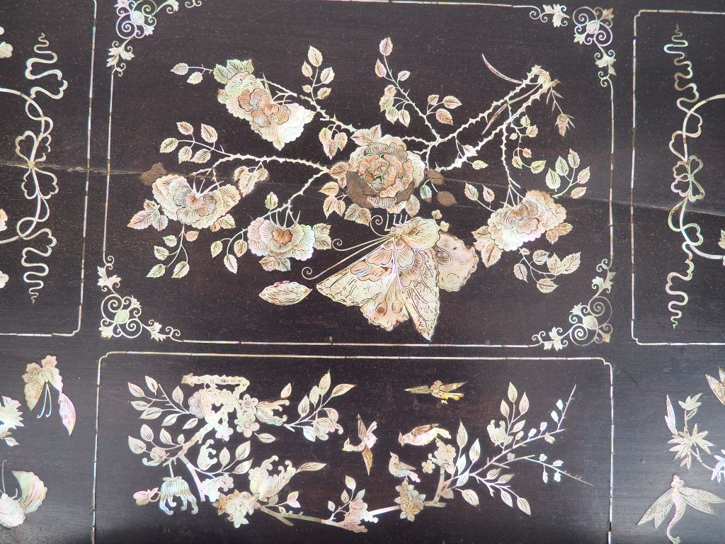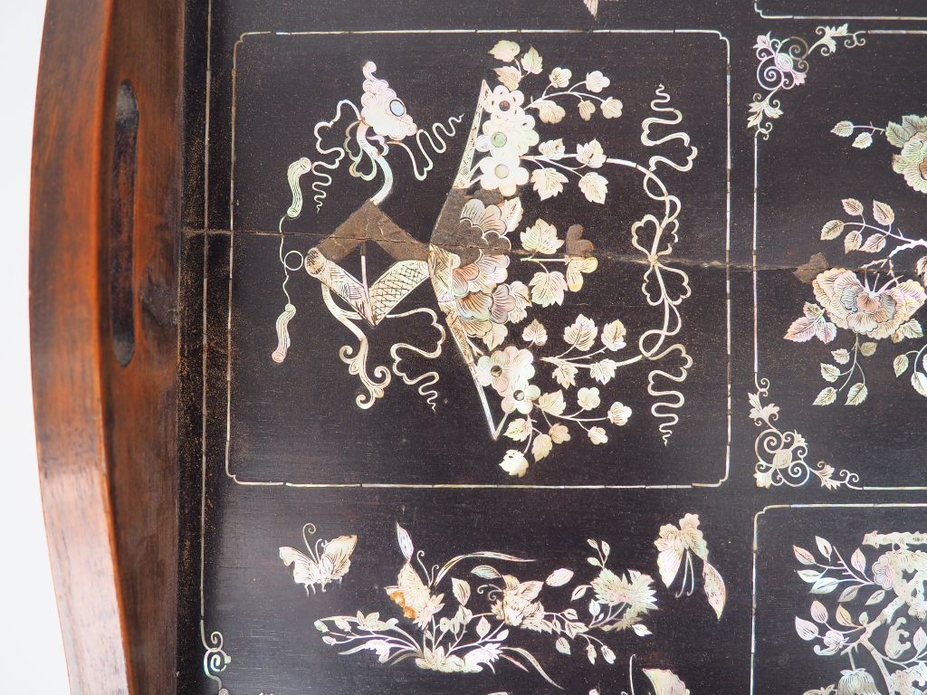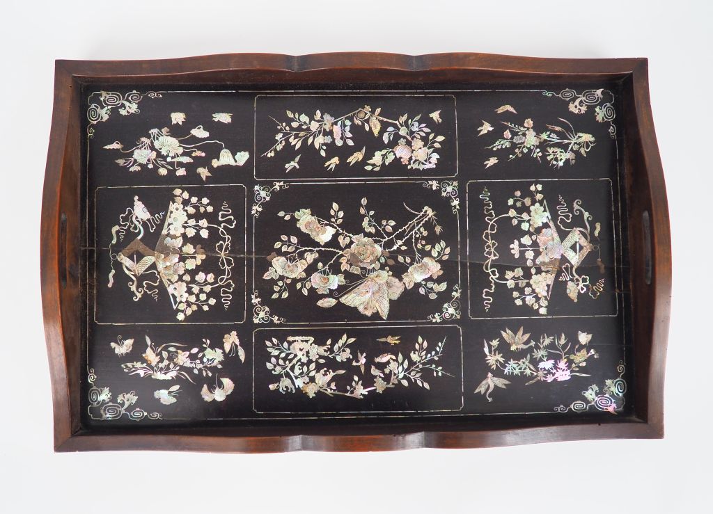 Indochine vers 1920 Plateau en bois à décor incrusté de nacre figurant des compositions florales, papillons et citrons digités. Dim. 65 x 36 cm Manques et gerces