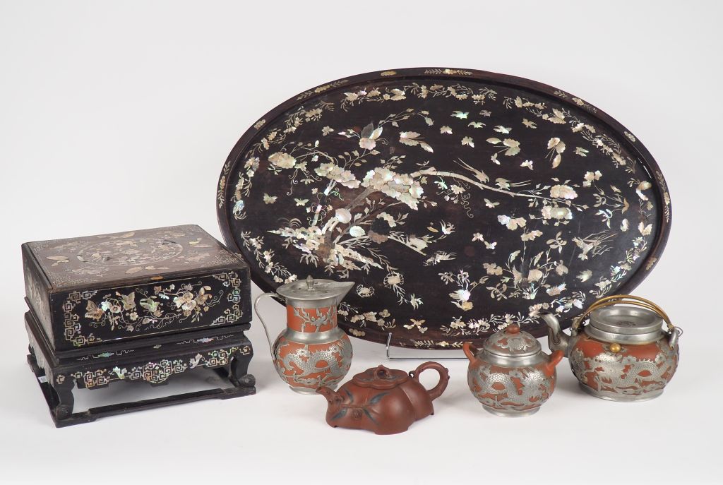 Indochine vers 1920 Service à thé comprenant quatre pièces en grès de yixing dont l’une à panse godronnée à décor en léger relief de branches de pins de longévité (marquée Jiangxi style de théière sous la dynastie Qing). On y joint un plateau de forme ovale et un coffret à thé en bois incrusté de nacre à décor de papillons, fleurs et végétaux. Usures et manques. Dim18 x 25 cm L. plateau ovale 64,5 cm