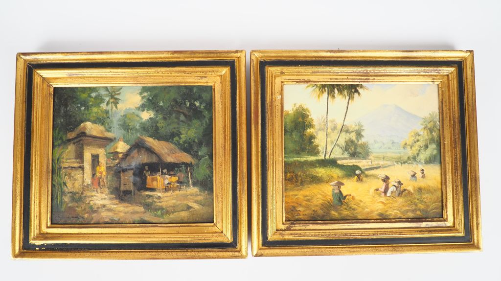 Indochine, vers 1930, Deux huiles sur toile représentant une scène de village et une scène de récolte dans les champs. Dim.30 x 35 cm