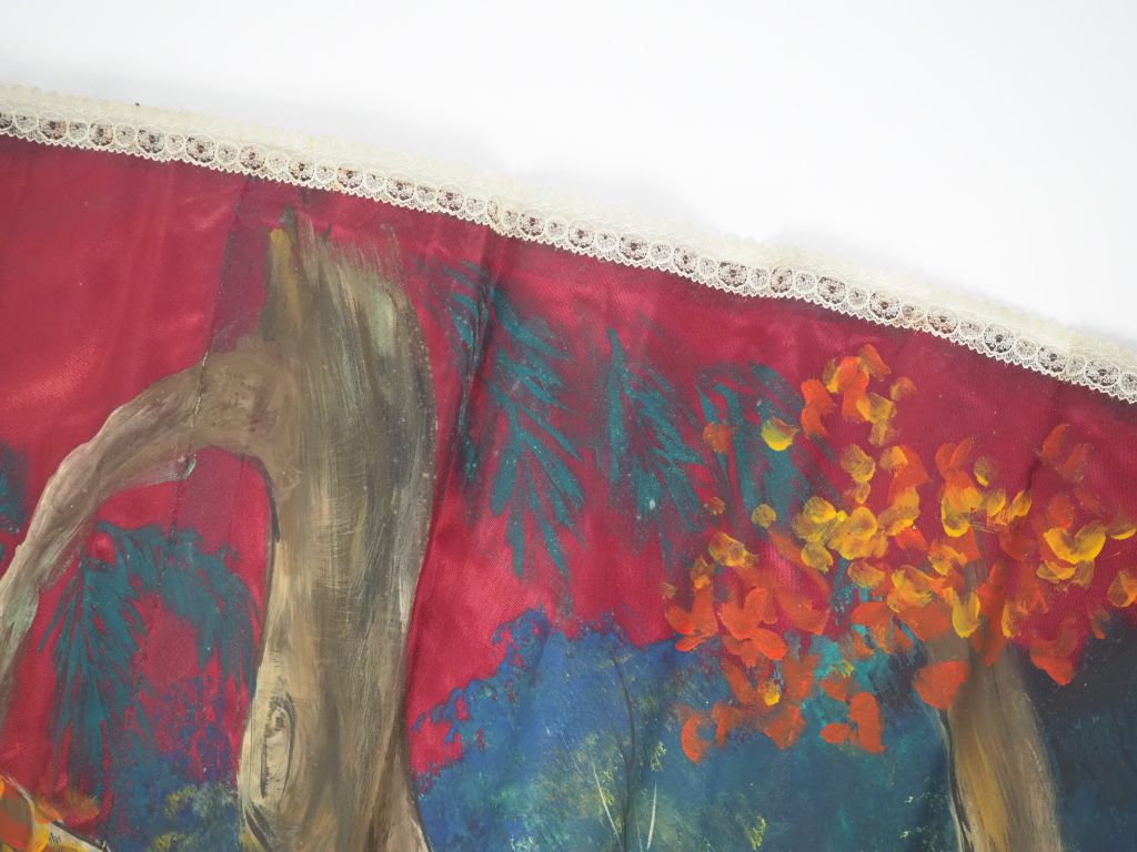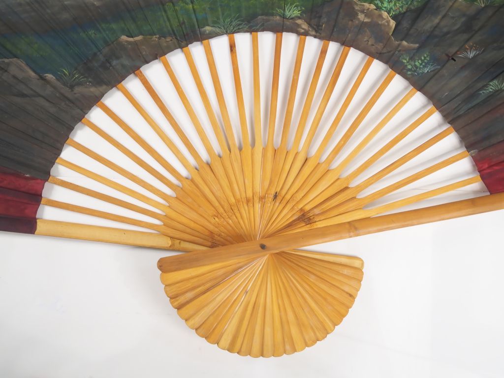 Indochine, vers 1930, Gouache sur éventail à décor polychrome de paysans avec charrue et bœufs Dim. 202 x 340 cm