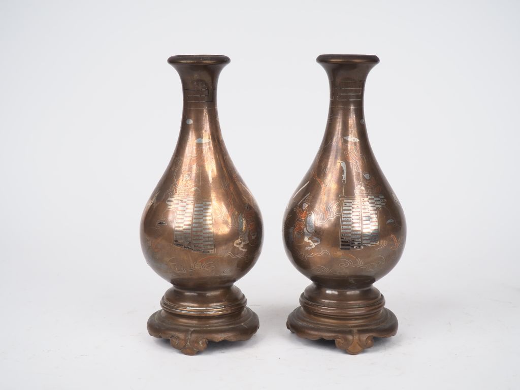 Indochine, XIXe siècle, Paire de vases balustres en bronze à patine claire, à décor niellé d'argent de personnages. H. 24 cm