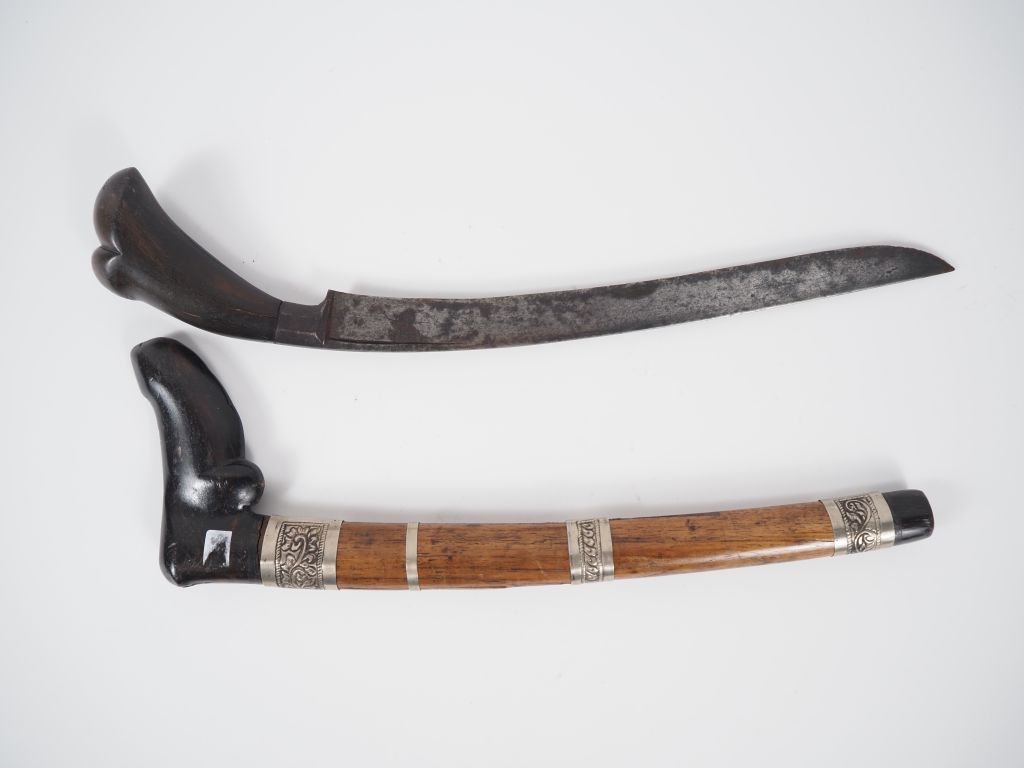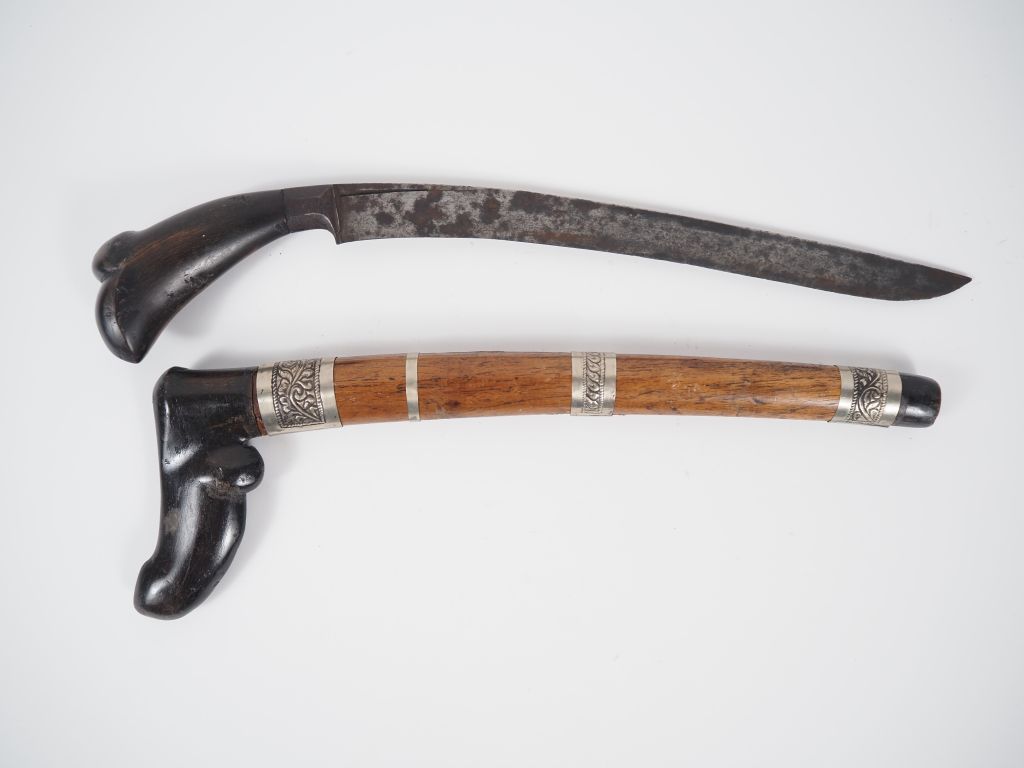 Indonésie, XIXe Poignard Badik , poignée et fourreau en bois, lame en acier. L. 44 cm.