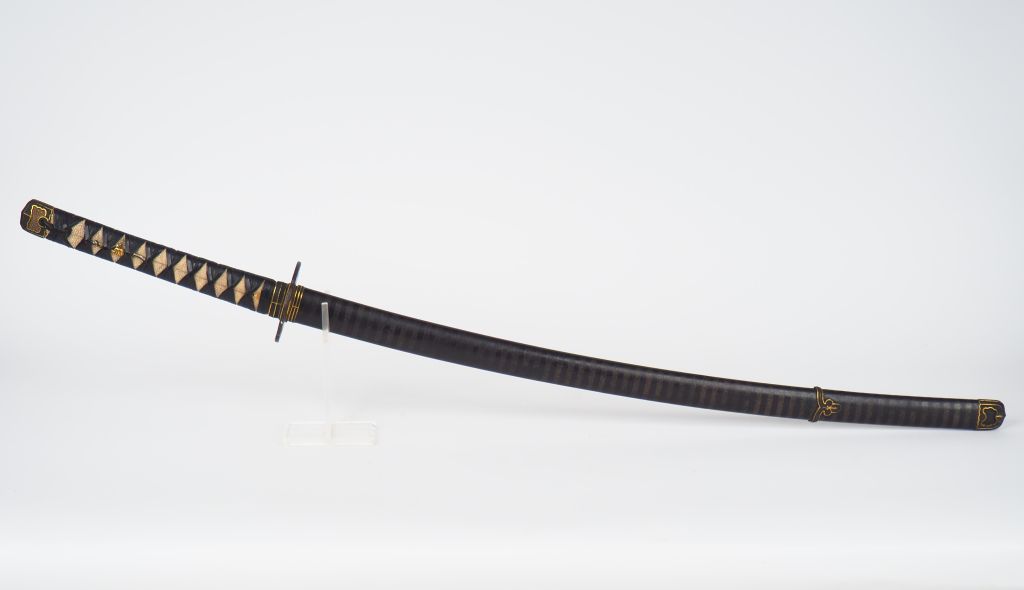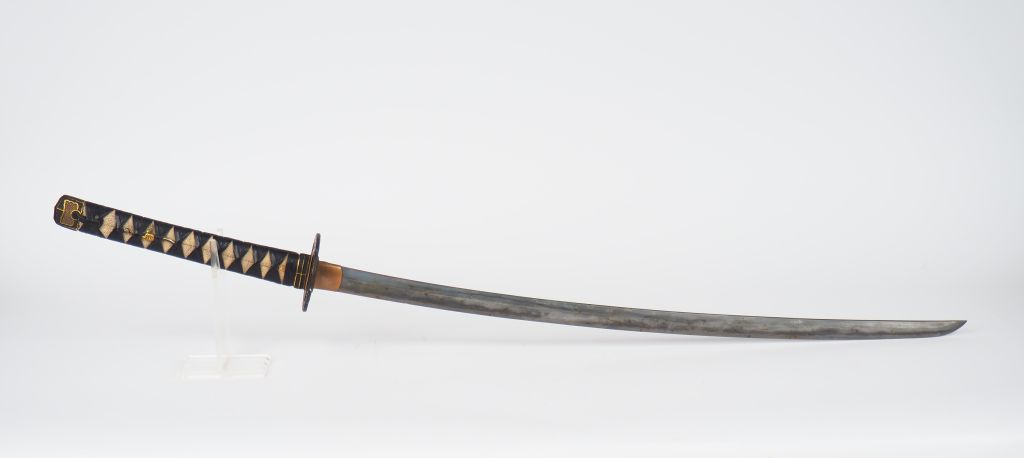 Japon, école de Bizen, période Muromachi, XVe siècle (pour la lame) KATANA à lame à shinogi-zukuri, gunome hamon peu lisible, nakago à deux mekugi-ana, signé Morimitsu , koshirae de type handachi, avec fourreau laqué noir à décor alternant anneaux mats et anneaux en nashiji, les éléments de style shakudo et rehauts dorés, les menuki figurant lance et bâton de commandement, la tsuba mokko-gata en fer, ajourée de feuilles d’aoi et incrustée de motifs géométriques et stylisés en sentoku. (Lame graissée, salissures, pointe du kissaki légèrement ébréchée) L. 70,5 cm