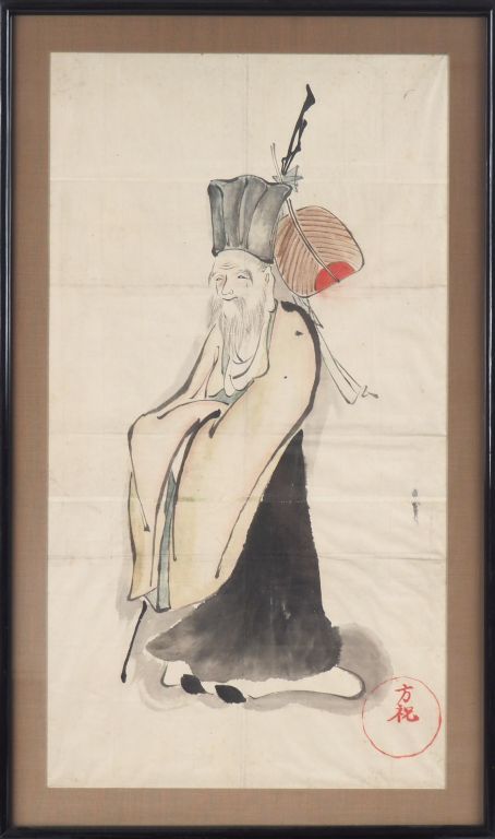 Japon, encre noire sur papier représentant Jurojin. Signée en bas à droite. Dim. 64 x 35 cm.