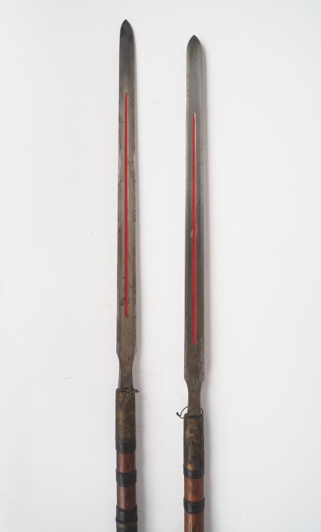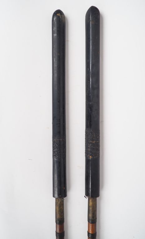 Japon, période Edo, Deux lances de type suyari à rainure centrale Hi soulignée en rouge , avec long manche rehaussé de bague en métal fourreaux laqués noir. (Non démontées, manques)
