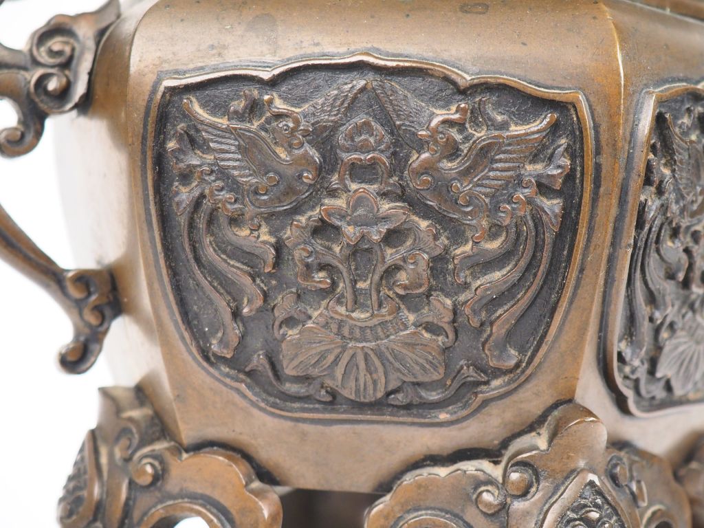 Japon, période Meiji (1868-1912) Brûle-parfum en bronze, reposant sur quatre pieds cambrés sur un socle hexagonal, à décor finement ciselé d’oiseaux. La prise du couvercle en haut-relief reprenant la forme d’un qilin. Les anses reprenant la forme de ruyi. H. 32 cm