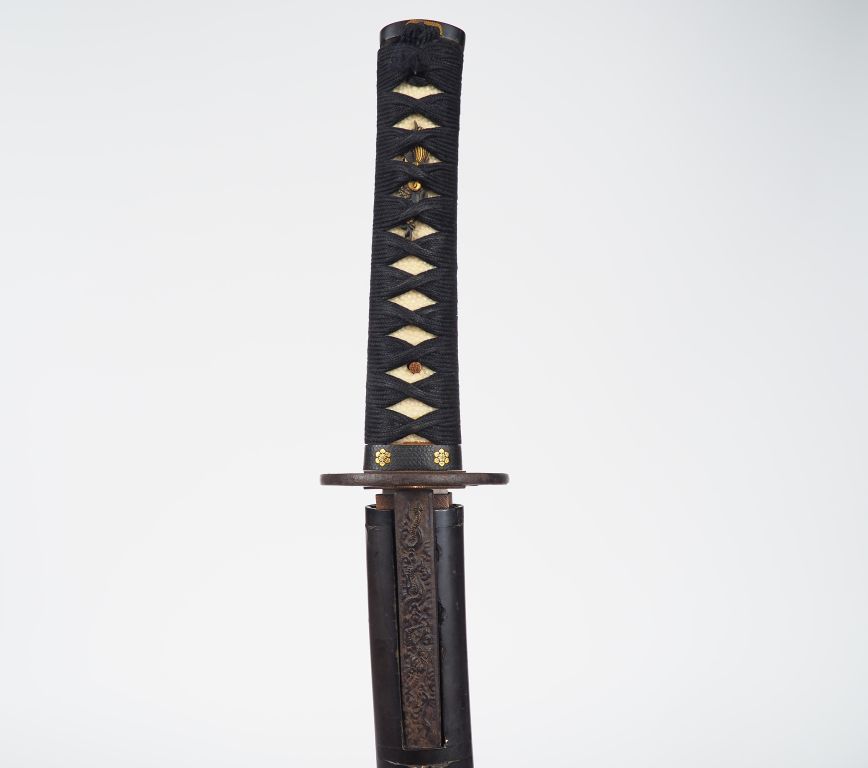 Japon, période Muromachi, XVe-XVIe siècle WAKIZASHI à lame à shinogi-zukuri, gunome hamon régulier, nakago suriage, à trois mekugi-ana, non signé , kashirae avec fourreau laqué noir orné de pivoines en laque brun-rouge et or, sukashi tsuba en fer figurant une gerbe, fuchi en shakudo, kashira simple, deux menuki à motifs floraux , kogai et kogatana à décor repoussé de dragons. (Salissures, kizu , kogai et kogatana oxydés) L. 46,5 cm