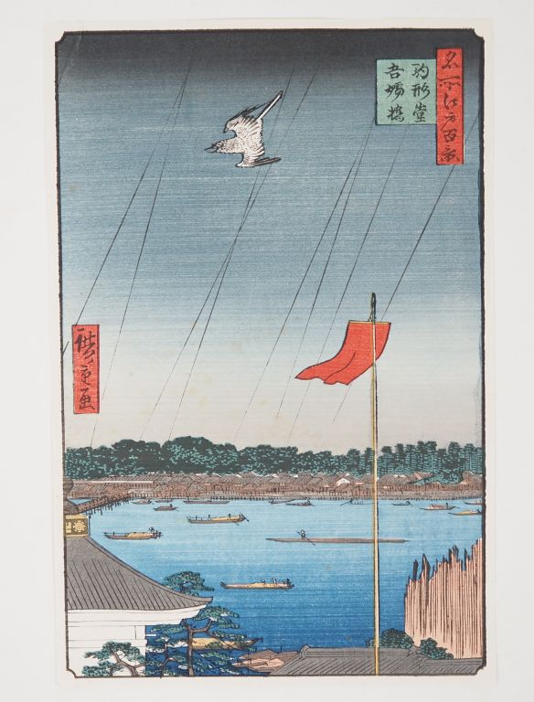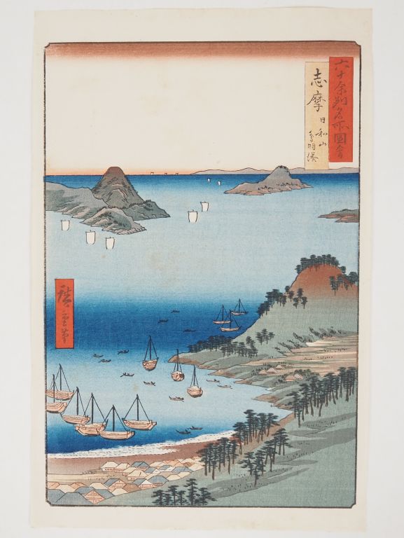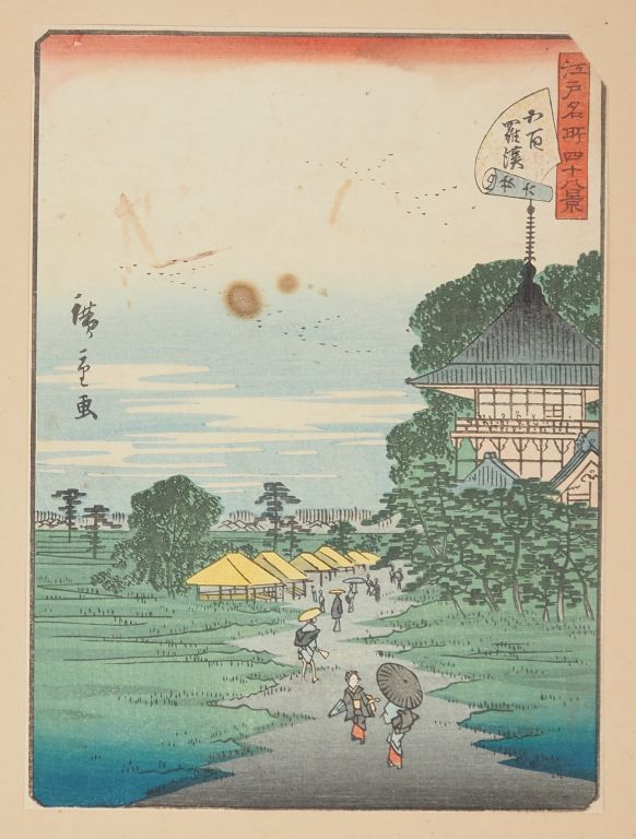 Japon, Quatre estampes de format oban tate-e dont : - deux d’Hiroshige I représentant le Mont Hiyori et le port de Toba dans la province de Shima, de la série des Lieux célèbres des 60 et quelques provinces, l’autre représentant le Hall Komagata et le pont Azuma, de la Série des 100 Vues Célèbres de Edo - deux autres d’Hiroshige II représentant le Sanctuaire Sannô Gongen, n°43 de la Série des 48 Vues célèbres de Edo et le Temple des 500 arhats, n°26 de la Série des 48 Vues Célèbres de Edo Usures, déchirures sur certaines, insolées. Dim. 29 x 19 cm