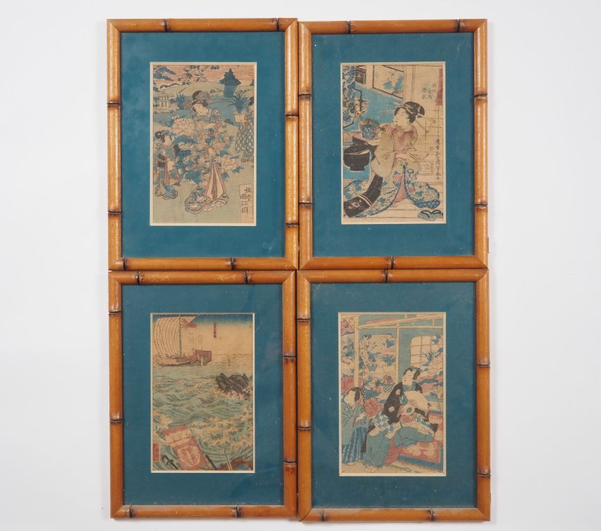 Japon, travail moderne, Ensemble comprenant quatre estampes sur papier crépon. Dim. 24 x 15 cm
