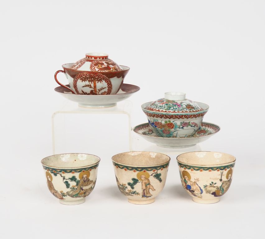 Japon, vers 1900, Coupes et soucoupes avec présentoir en porcelaine demi coquille, à décor de personnages. 9 pour le modèle corail. 5 pour le modèle polychrome. Diam. 10 cm On y joint trois coupes en porcelaine du Japon, à décor de personnages arhates.