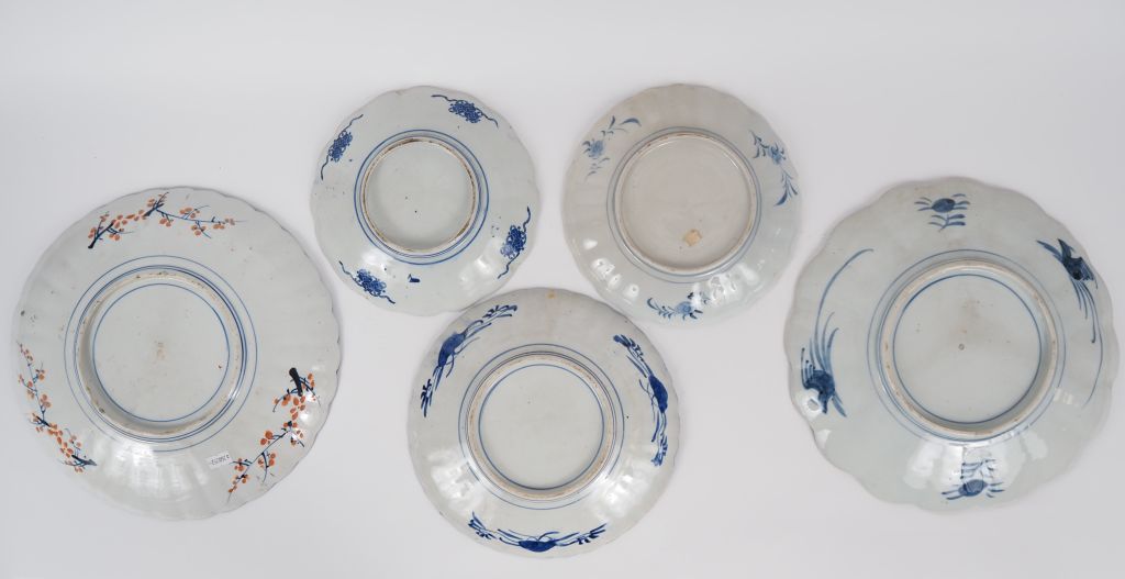 Japon, vers 1900 Ensemble de cinq plats floriformes en porcelaine d’imari, à décor en bleu, corail de jeux d’enfants, animaux fantastiques, jardinières, compositions florales. Diam. 21 à 32 cm (Eclats, fels et égrenures)