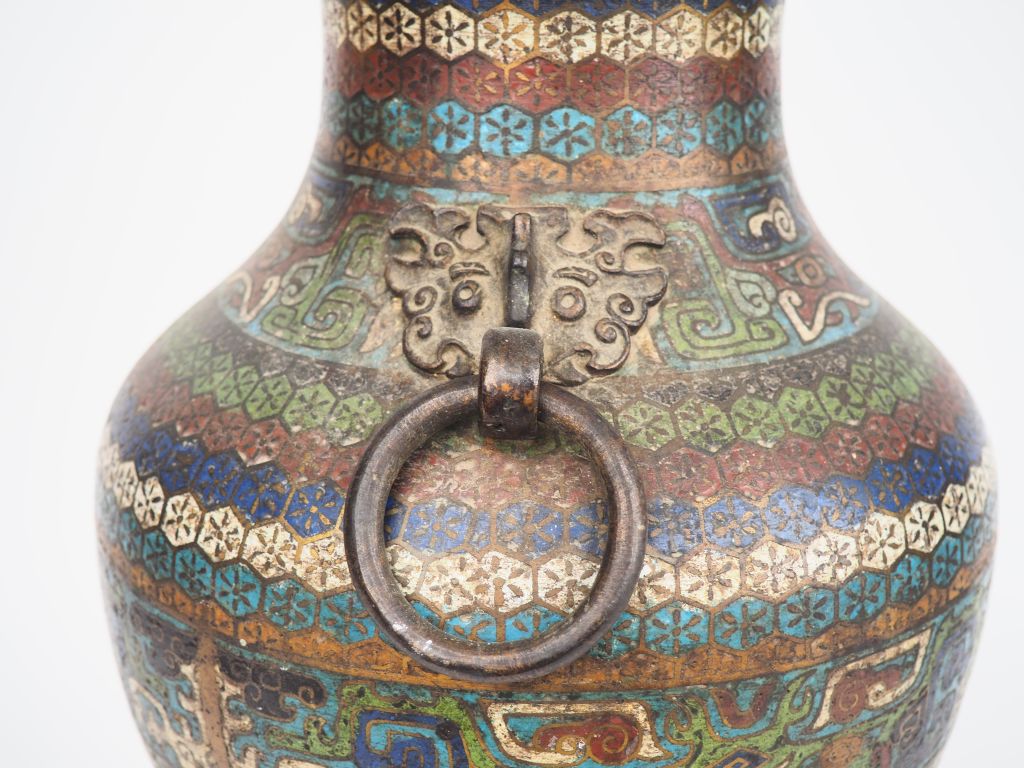 Japon, vers 1900, Important vase balustre en bronze et émaux champlevés à décor de motifs géométriques. Deux masques de taotie retenant des anneaux formant anses sur le haut de la panse. H.41 cm.